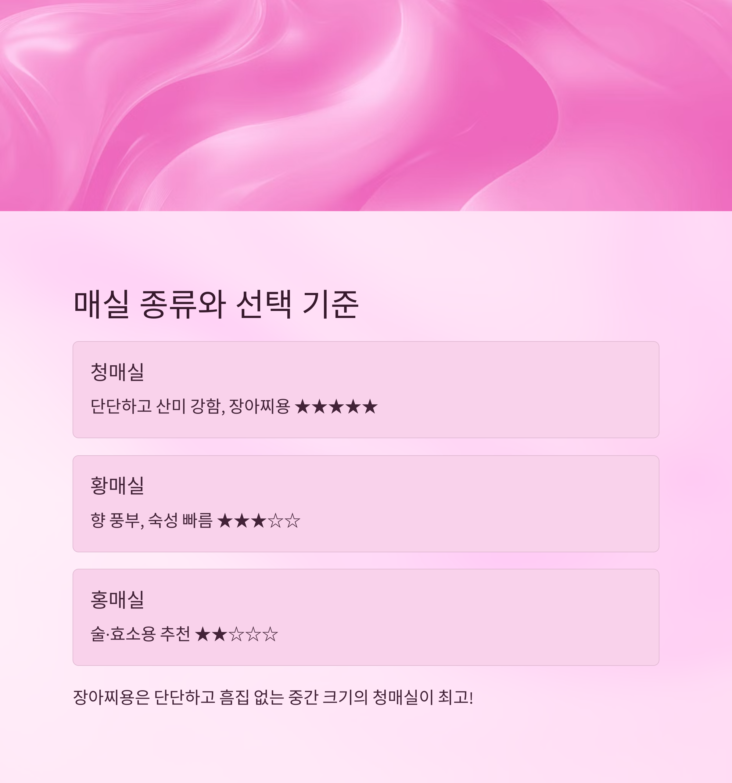 | 황매 | 노랑 | ★★★☆☆ | 향 풍부, 숙성 빠름 |
