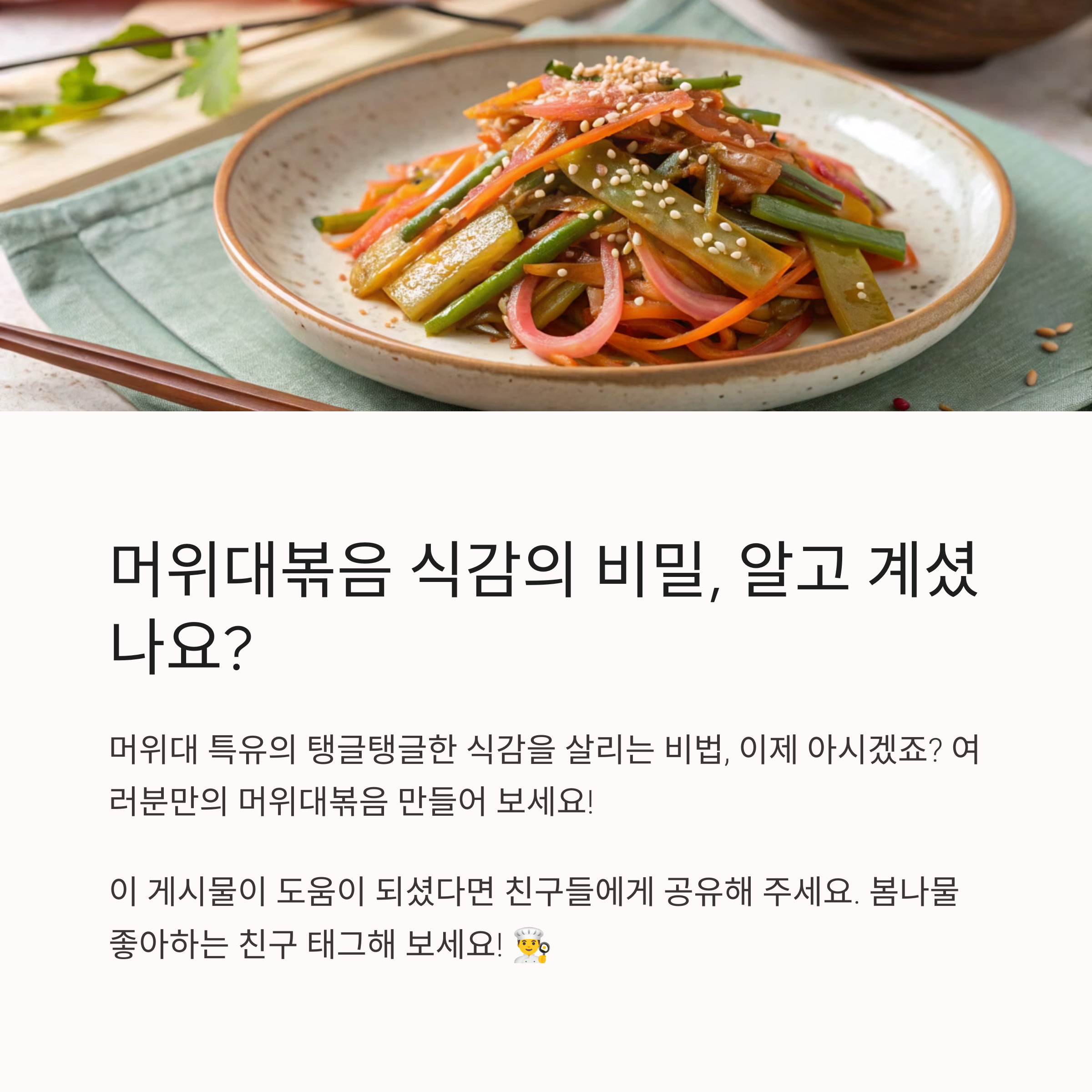 즉, 식감을 살리기 위해선 단순히 ‘익히기’보다는 ‘조절된 조리’가 필요하다는 말이에요. 기본적으로 머위대는 살짝 쪄낸 후 빠르게 볶는 방법이 가장 일반적이지만, 그 중간중간 손맛이 들어가야 진짜 맛이 살아나요!