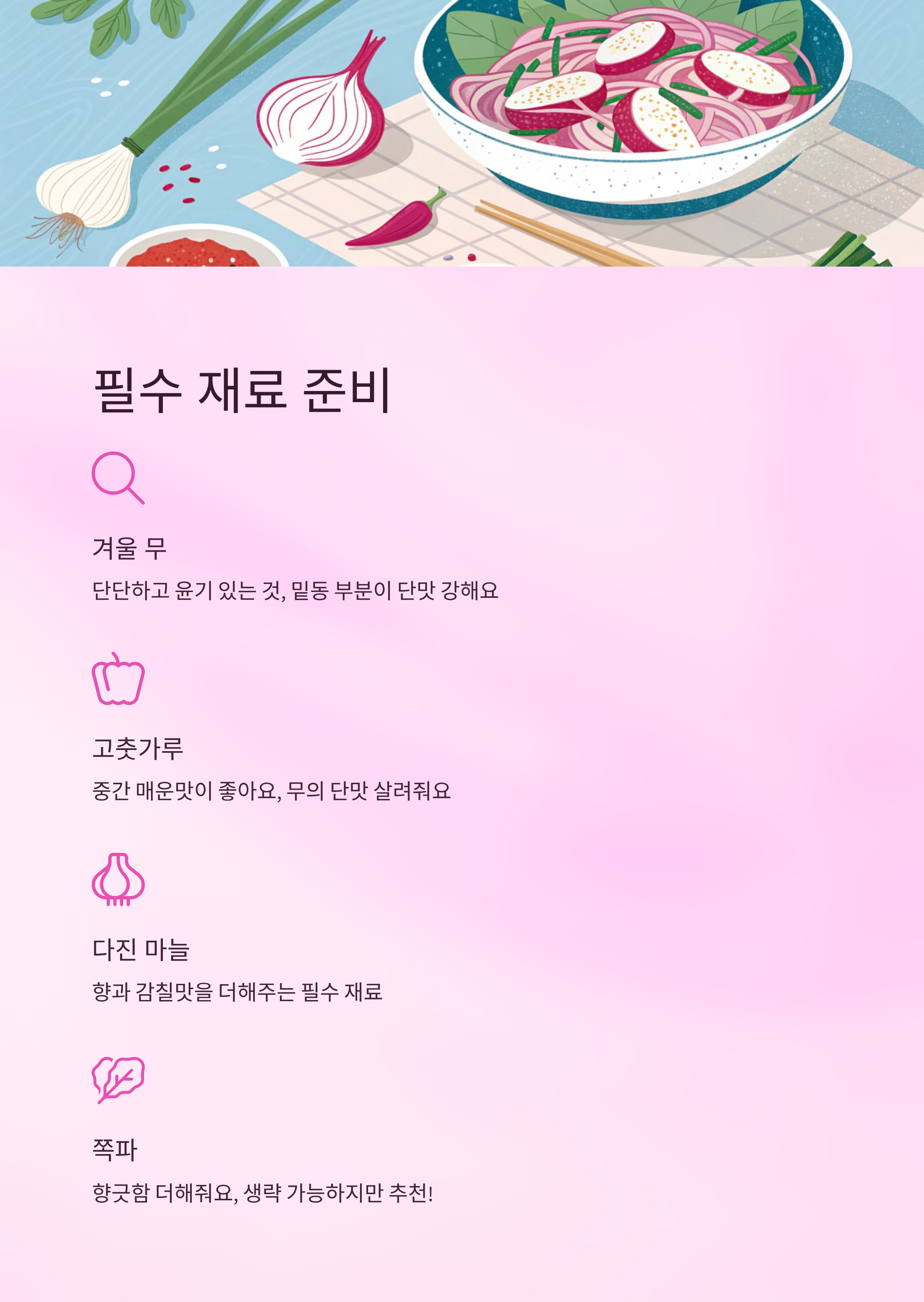 내가 생각했을 때 무생채는 단순한 반찬을 넘어 한국인의 정서가 담긴 음식 같아요. 쉽게 만들 수 있지만, 맛은 절대 만만하지 않다는 점이 매력이에요!