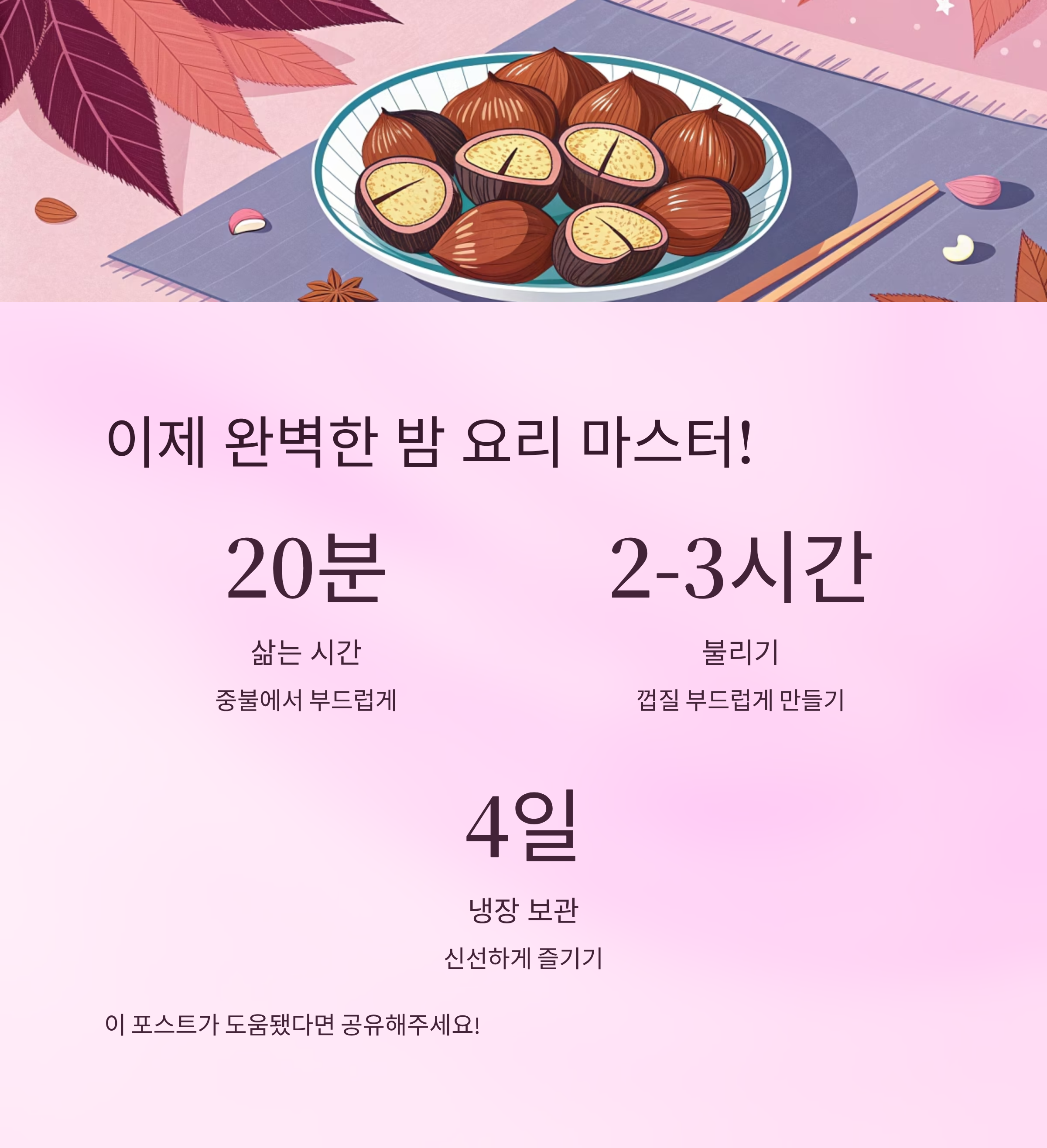 이제 밤 껍질 때문에 스트레스받을 필요 없어요! 이런 작은 팁만 잘 활용해도 누구나 부드럽고 고소한 삶은 밤을 만들 수 있답니다 😋