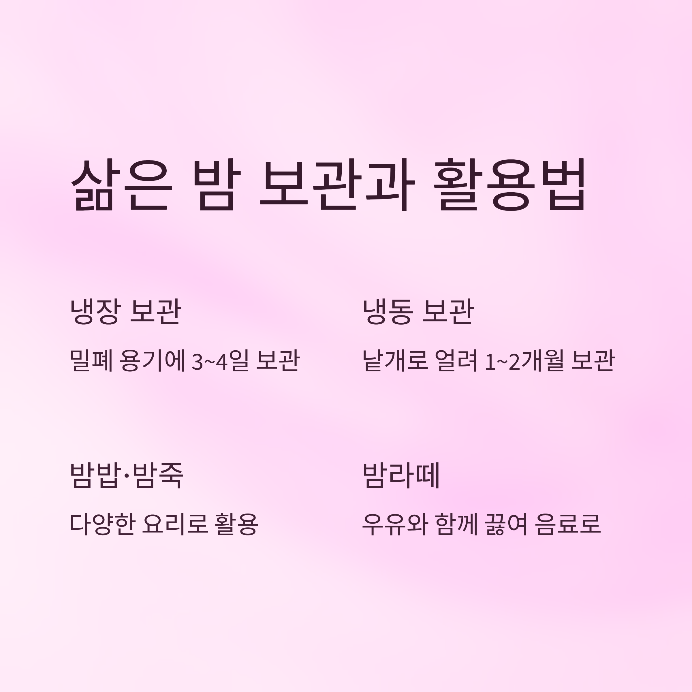 삶은 밤은 그대로 먹는 것도 좋지만, 밤조림, 밤밥, 밤죽, 밤케이크, 밤라떼 등 다양하게 변신할 수 있어요. 잘게 으깬 뒤 우유와 함께 끓이면 부드럽고 달콤한 밤우유도 완성돼요.