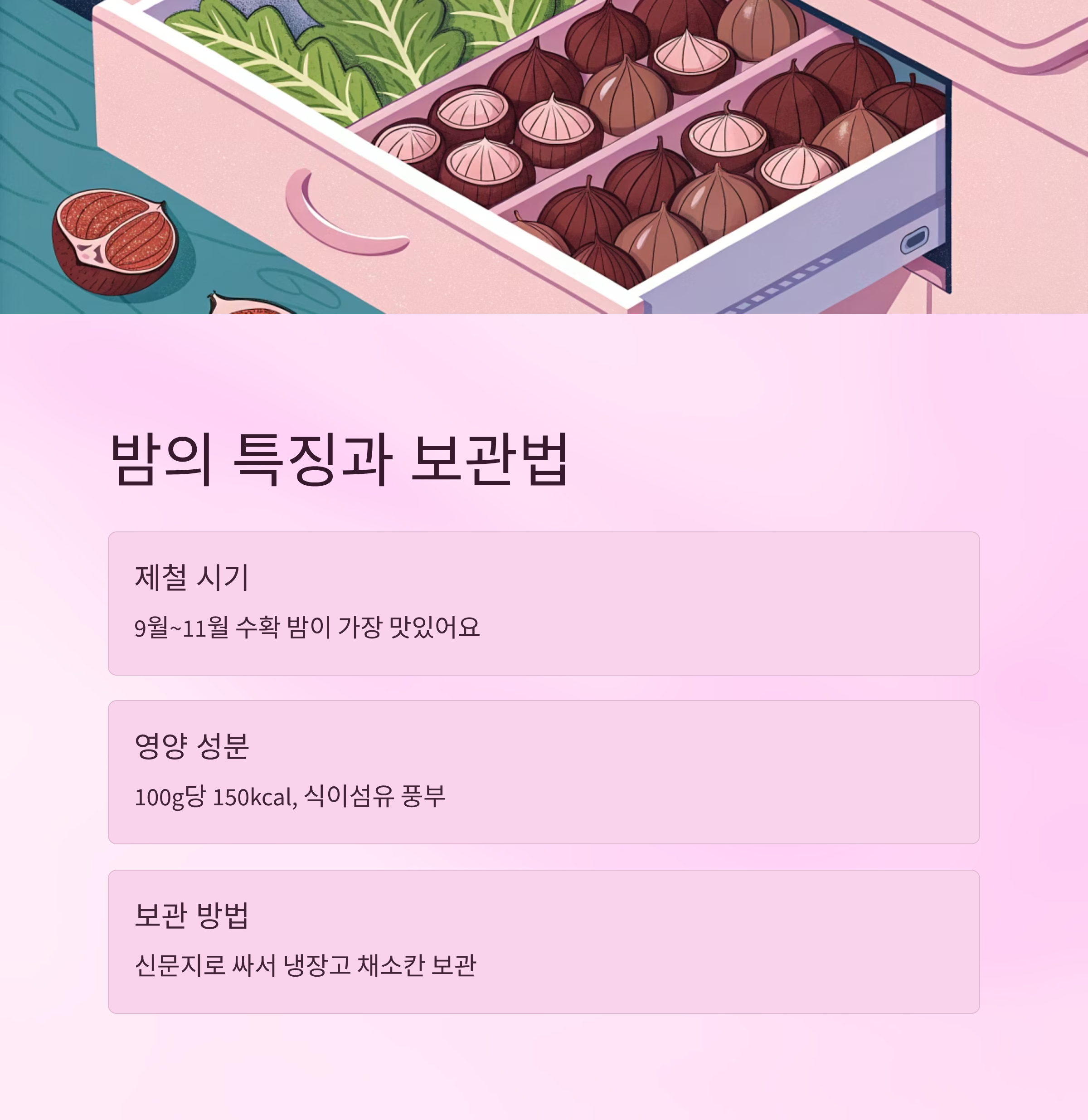 밤은 수분이 많아 상온에 오래 두면 쉽게 곰팡이나 벌레가 생기기 쉬워요. 보관할 때는 비닐봉지에 넣기보다는 신문지로 싸서 냉장고 채소칸에 넣어두는 게 좋아요. 장기 보관하려면 껍질째 냉동 보관도 가능하답니다. 다만 삶기 전에 꺼내 해동을 잘 해야 해요.