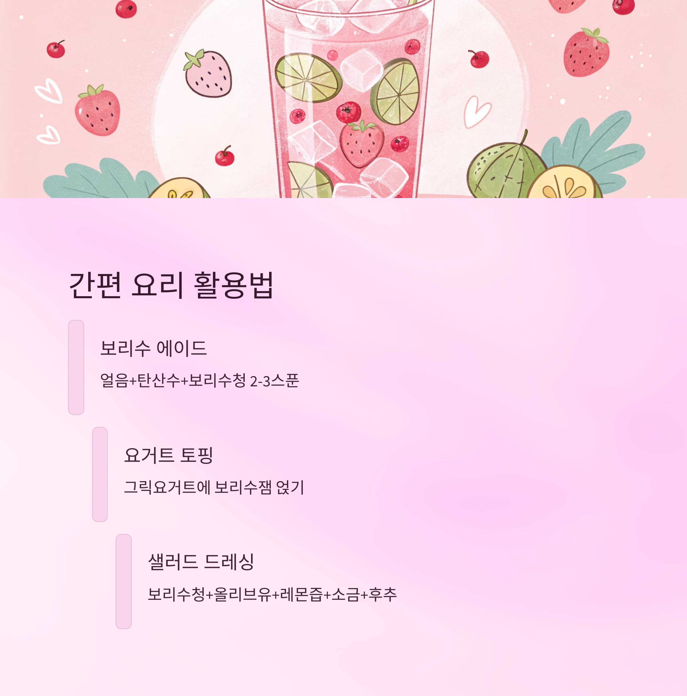 | 보리수에이드 | 보리수청, 탄산수 | 5분 | 얼음과 함께 시원하게 |