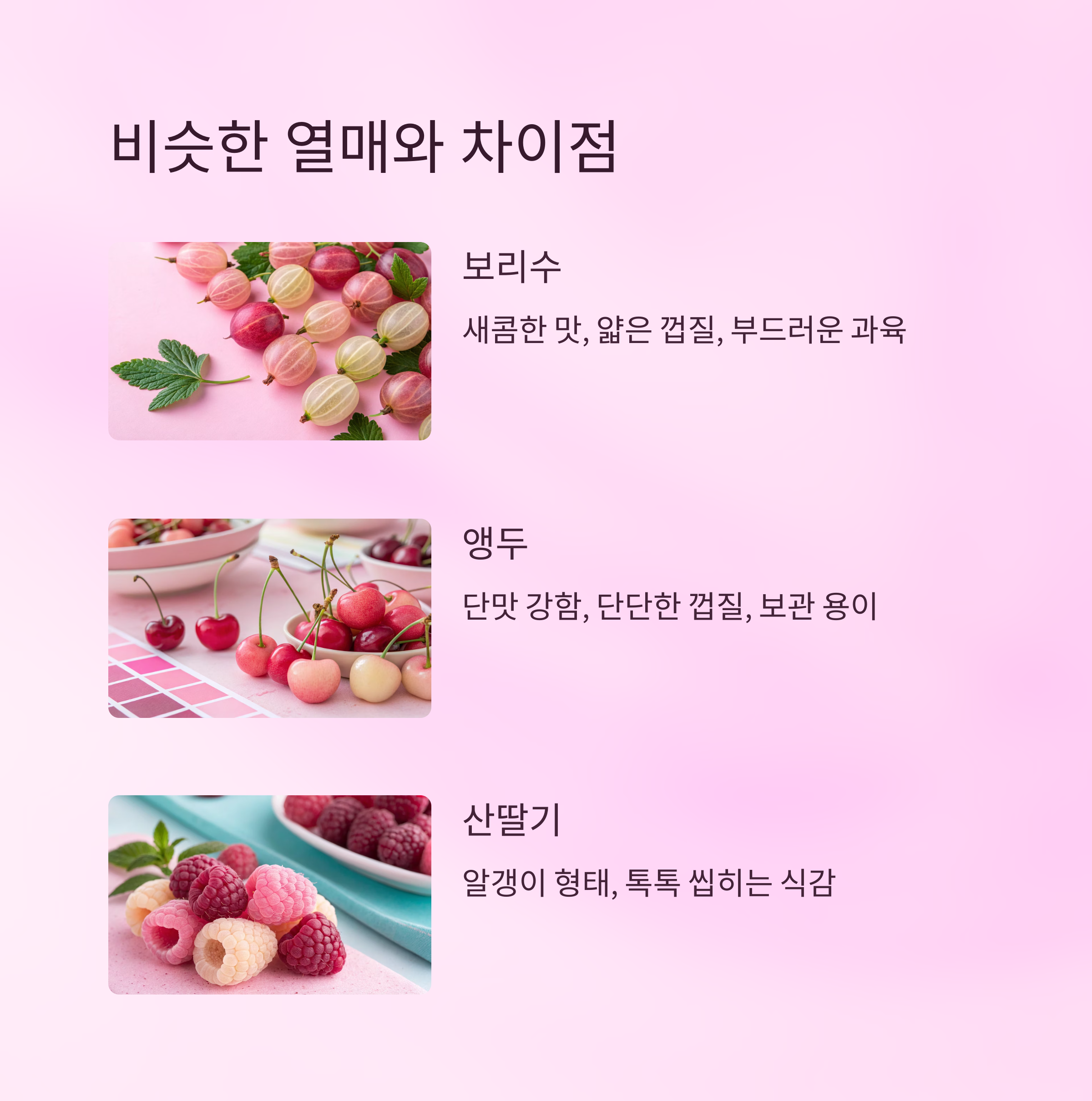 보리수는 다른 붉은 열매들과 종종 혼동되기도 해요. 특히 앵두나 산딸기, 체리와 비슷한 색과 크기 때문에 처음 접하는 분들은 헷갈릴 수 있어요. 하지만 이들 각각은 맛, 식감, 활용법이 다르답니다. 보리수는 앵두보다 더 새콤하고, 산딸기보다는 과육이 부드럽고 톡톡 터지는 느낌이 있어요.