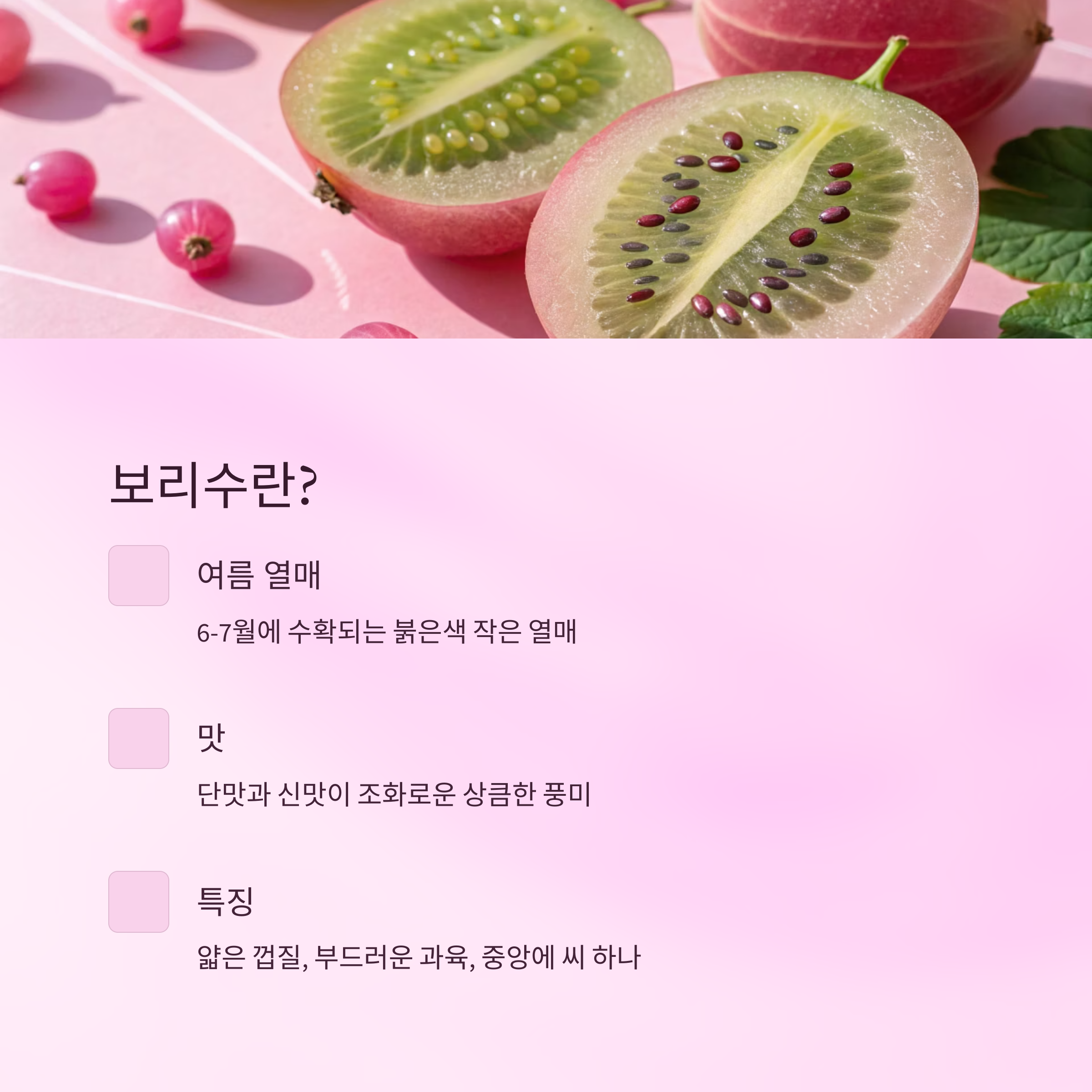 이처럼 비슷한 열매처럼 보여도 활용도와 보관법, 맛에서 큰 차이가 있어요. 여름철 다양한 과일을 시도해보는 분들에게 보리수는 꽤 매력적인 선택이 될 수 있어요. 과일청이나 잼, 음료에 쓰기 좋은 열매로, 시즌이 짧기 때문에 제철일 때 꼭 챙겨보면 좋겠어요.
