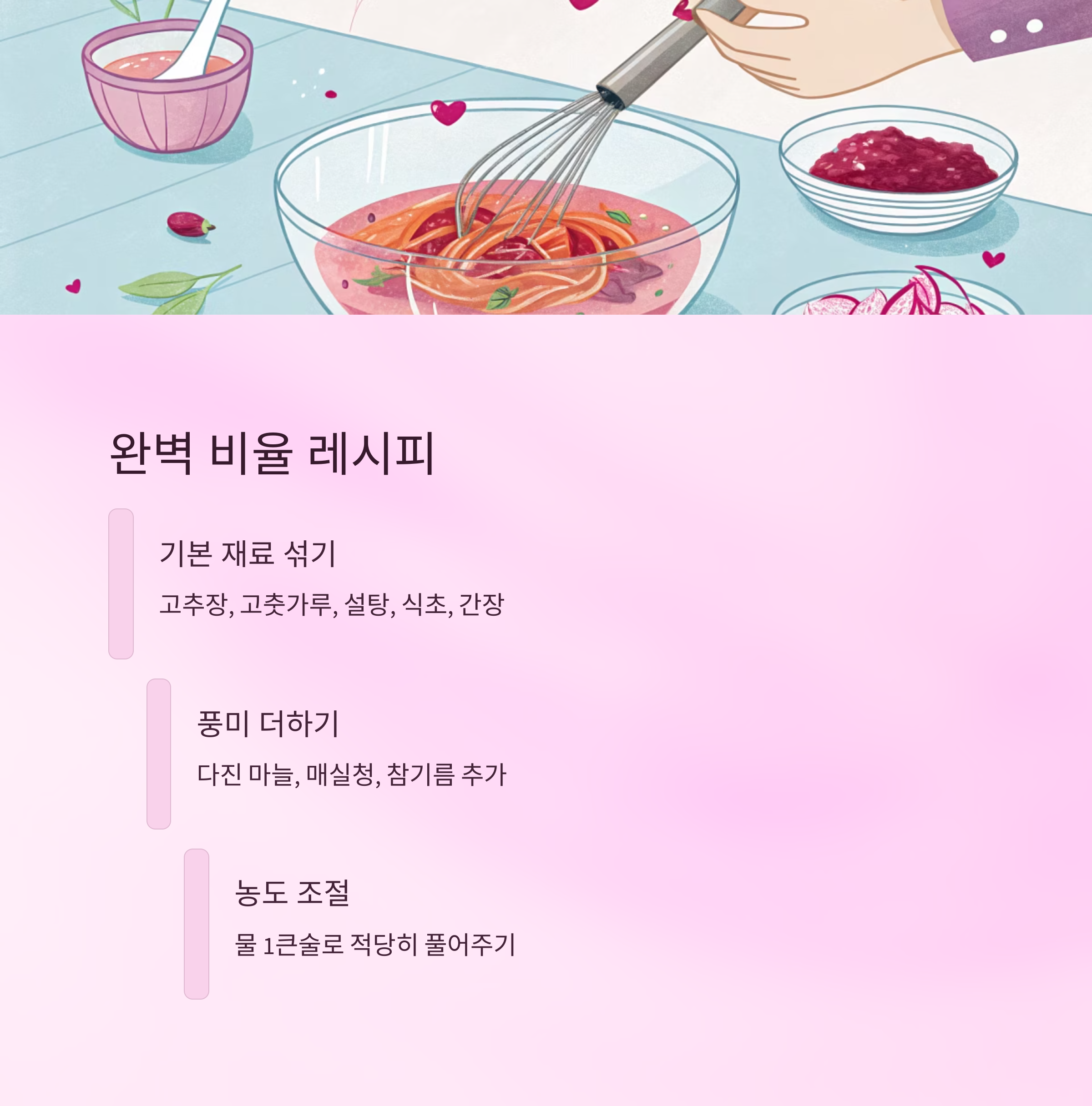 고추장의 농도도 중요한 포인트예요. 너무 되직하면 면에 잘 섞이지 않고, 너무 묽으면 국물처럼 흘러내려요. 물기가 적은 재료를 기준으로 섞어야 깔끔한 양념장이 완성된답니다 🌶️