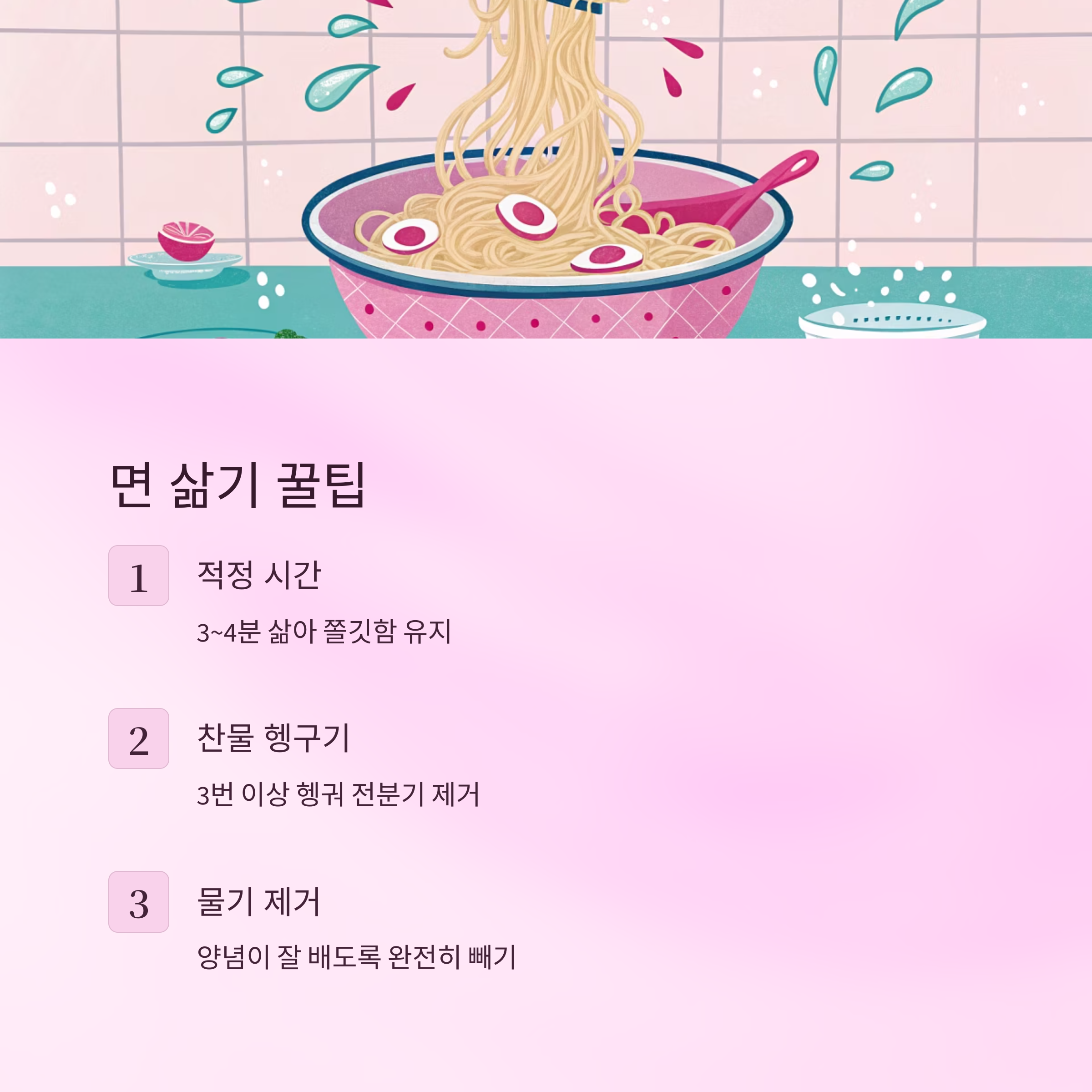 | 헹구기 | 찬물로 3번 이상 | 쫄깃함 유지 |