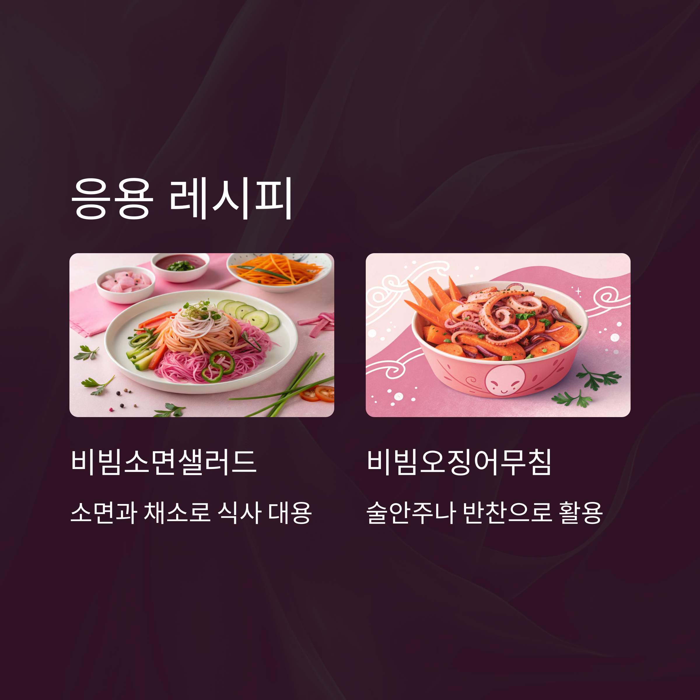 A4. 네, 샐러드, 오징어무침, 두부요리, 심지어 밥 비빔장으로도 좋아요. 비빔국수 외에도 다양하게 활용할 수 있어요!