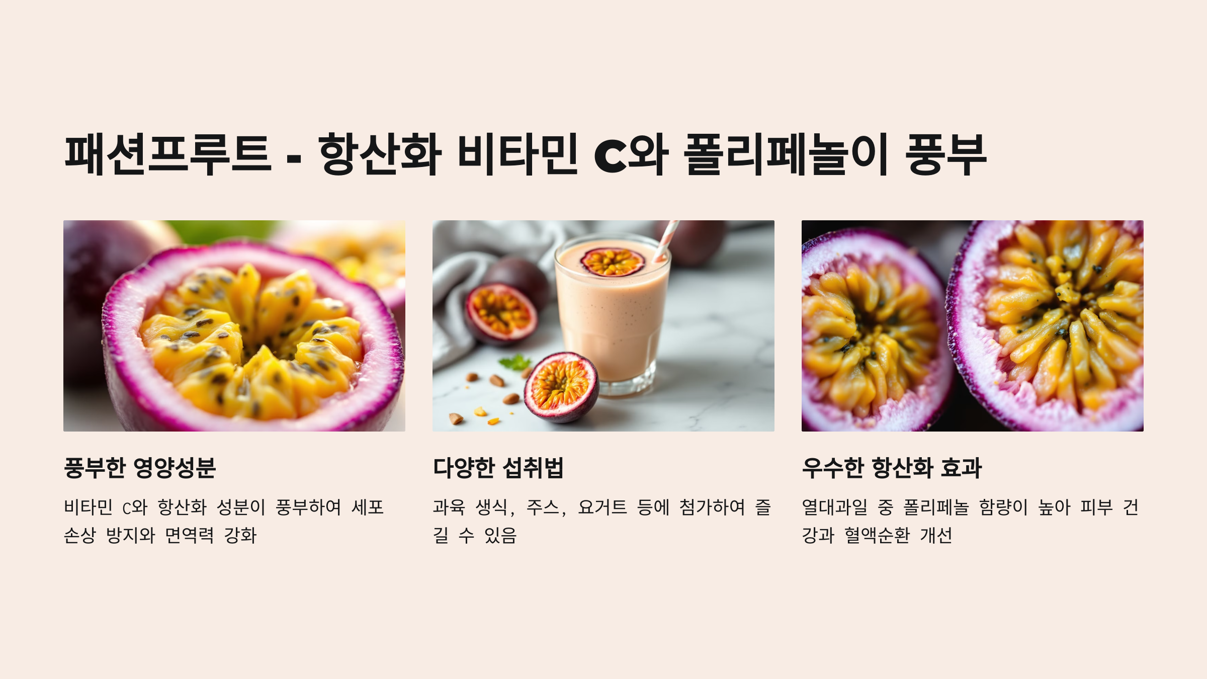 효능: 패션프루트는 비타민 C와 항산화 성분이 풍부하여 세포 손상을 방지하고 면역력을 강화합니다. 또한 소화를 돕고 피로 회복에 좋습니다. 특히 열대 과일 중에서도 폴리페놀 함량이 높은 과일로, 피부 건강에 좋고 혈액순환을 개선하는 효과도 있습니다.