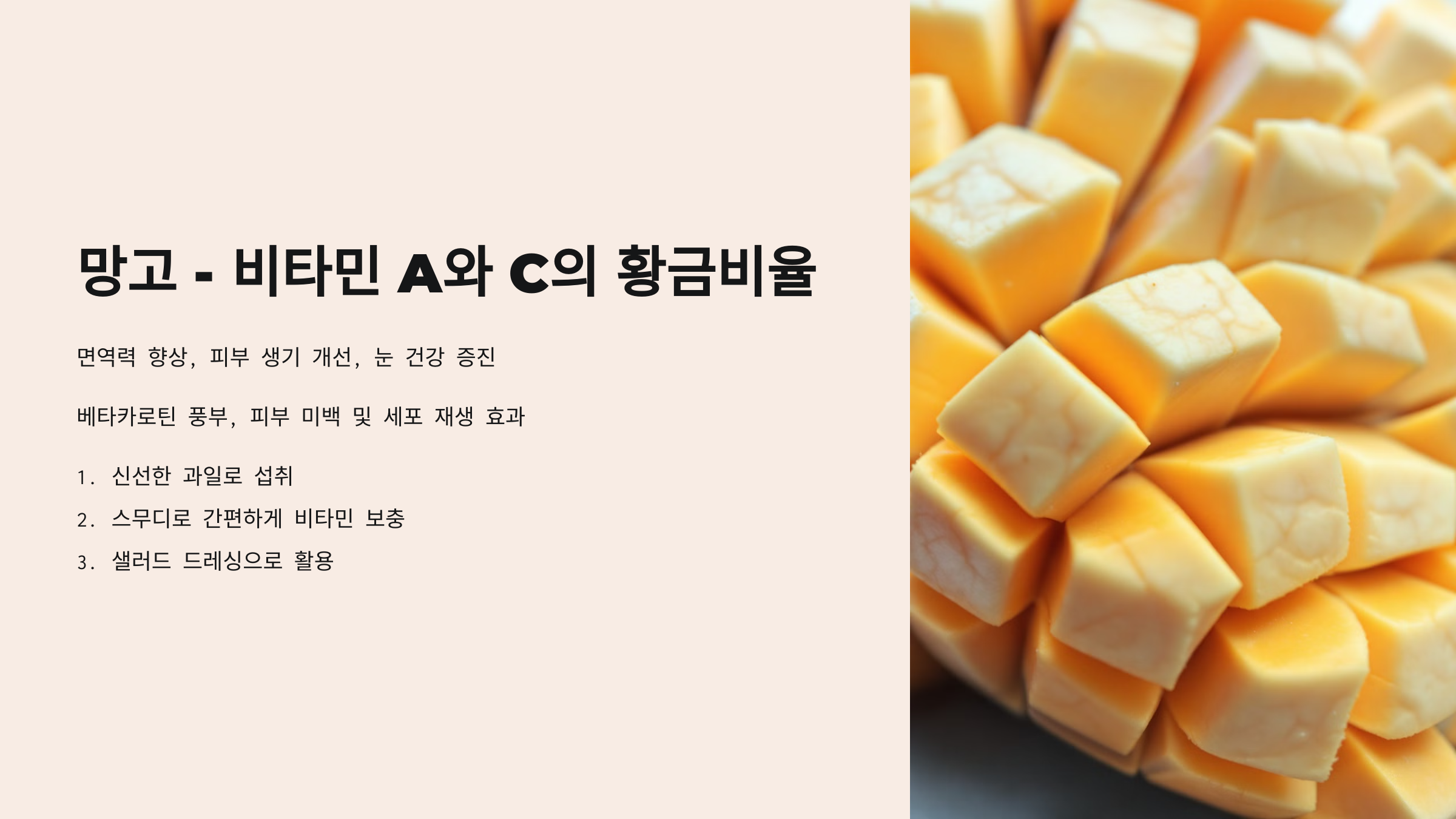 효능: 망고는 비타민 A와 C가 풍부해 면역력을 높여주고 피부를 밝고 생기 있게 가꾸어 줍니다. 특히 베타카로틴이 풍부해 눈 건강에도 좋습니다. 피부 미백과 세포 재생에도 효과적이므로 꾸준히 섭취하면 좋습니다.
