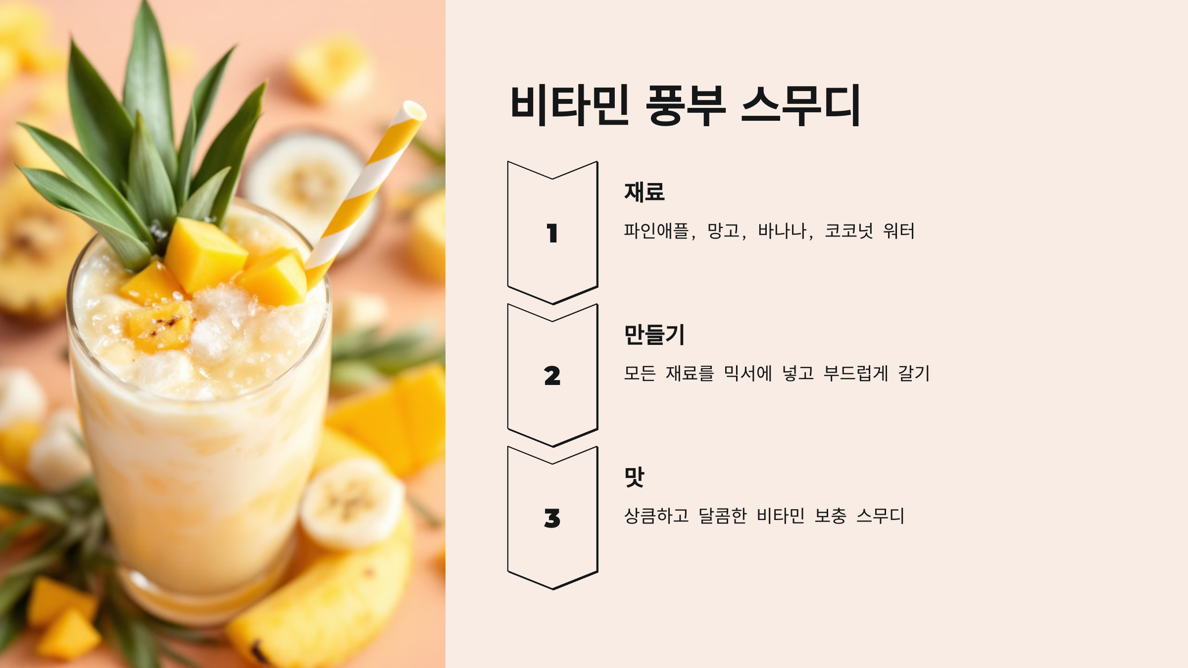 - 재료: 파인애플 1/2컵, 망고 1/2컵, 바나나 1개, 코코넛 워터 1컵