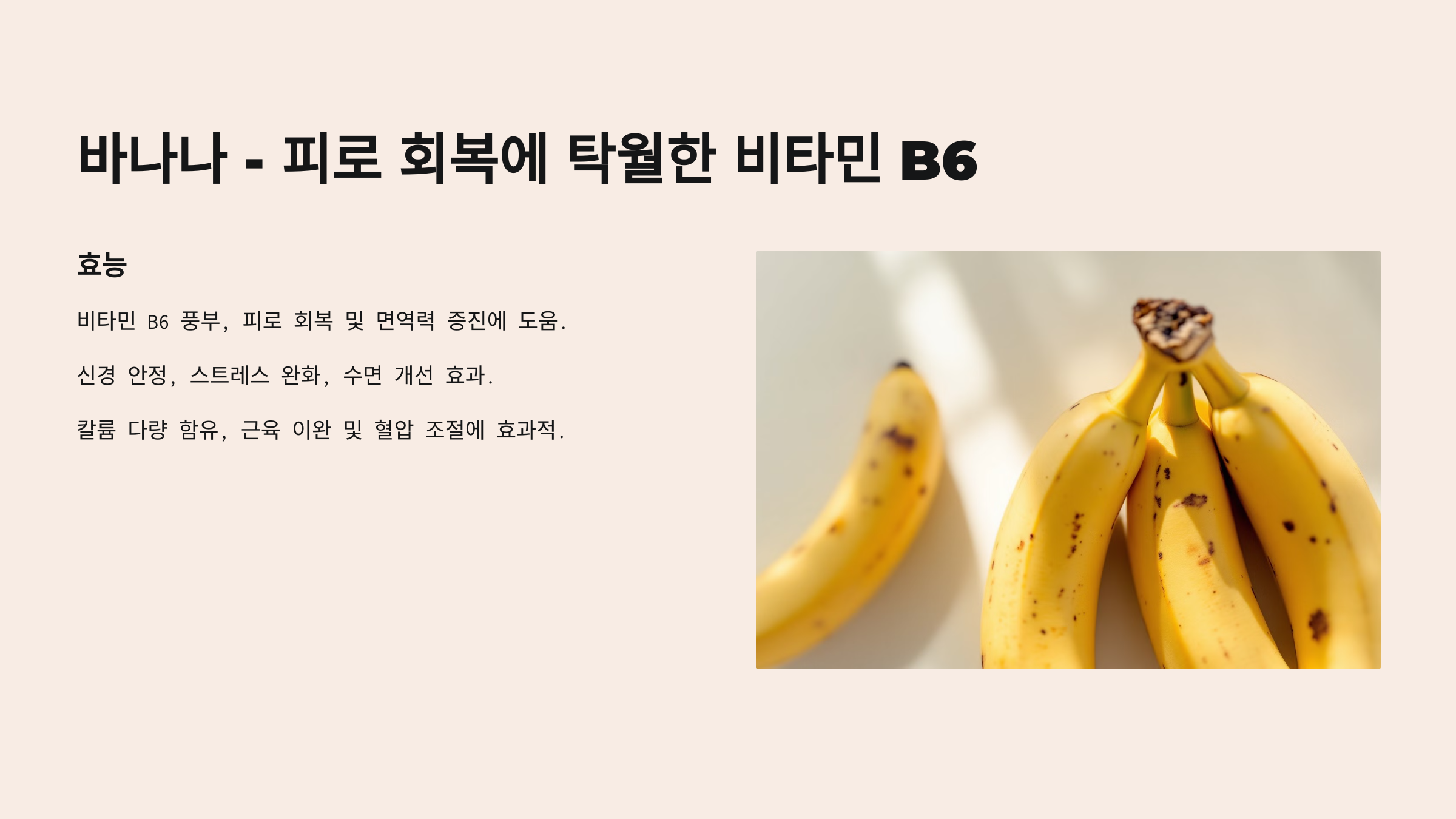 효능: 바나나는 비타민 B6가 풍부하여 피로 회복과 면역력 증진에 좋습니다. 또한 신경을 안정시키는 효과가 있어 스트레스 완화와 수면에도 도움이 됩니다. 바나나는 칼륨도 많아 근육의 긴장을 완화하고 혈압을 조절하는 데도 효과적입니다.