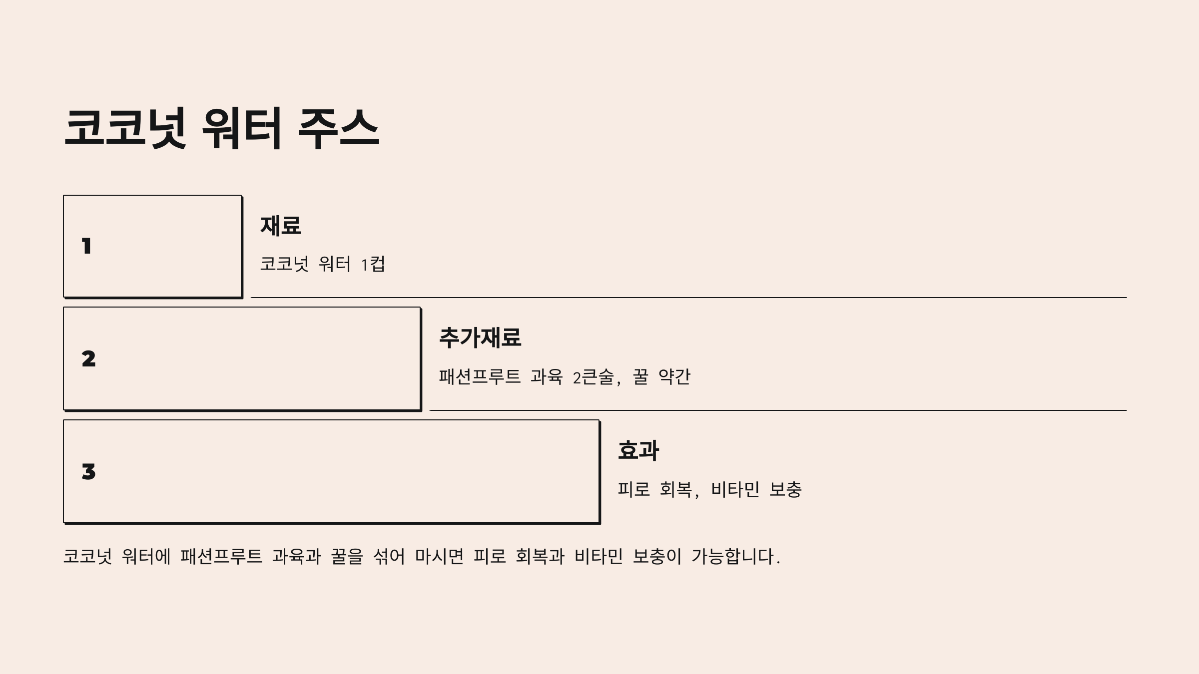 - 재료: 코코넛 워터 1컵, 패션프루트 과육 2큰술, 꿀 약간