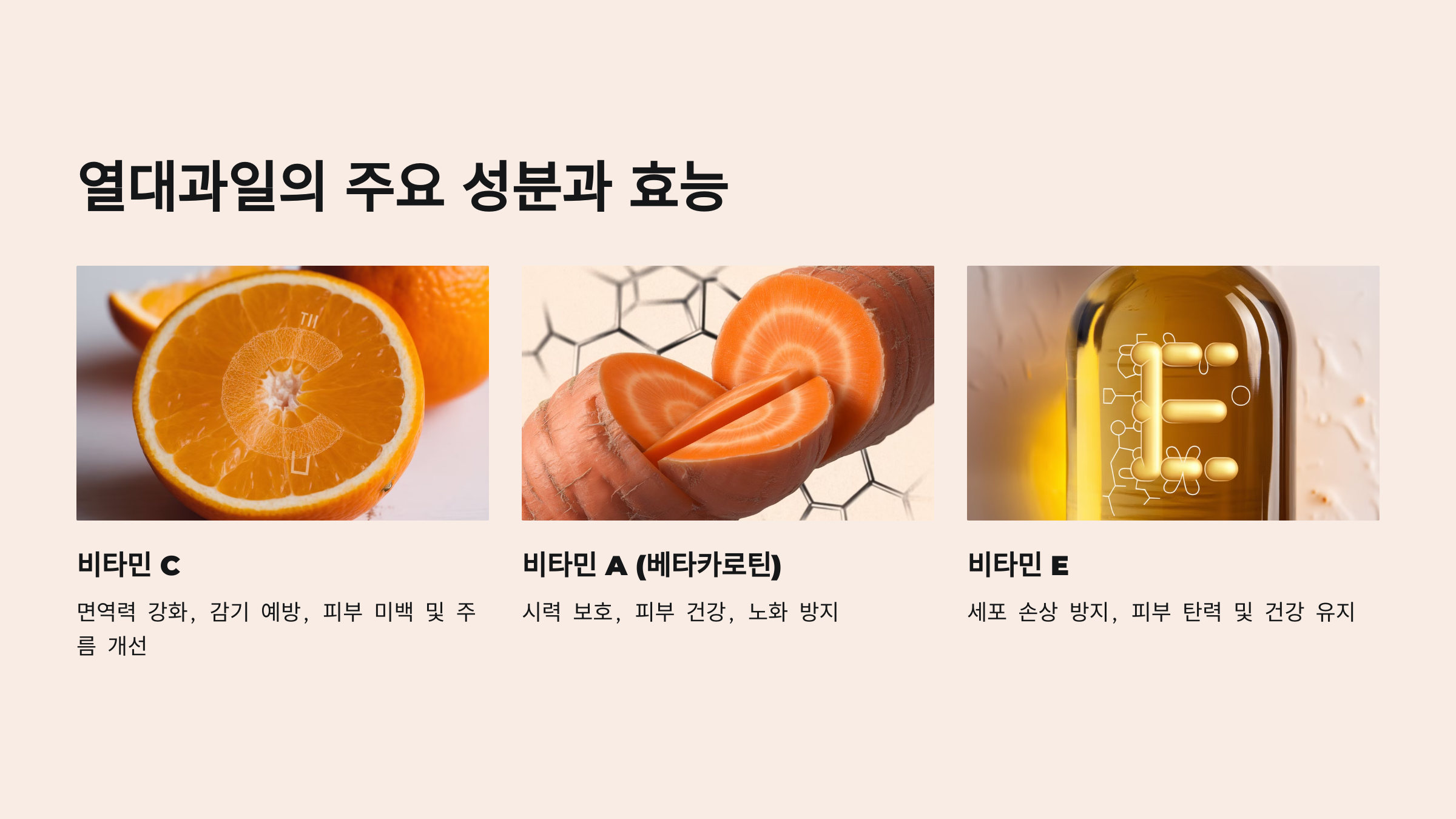 - 비타민 A (베타카로틴): 시력 보호와 피부 건강에 좋으며, 항산화 작용으로 노화를 방지합니다.