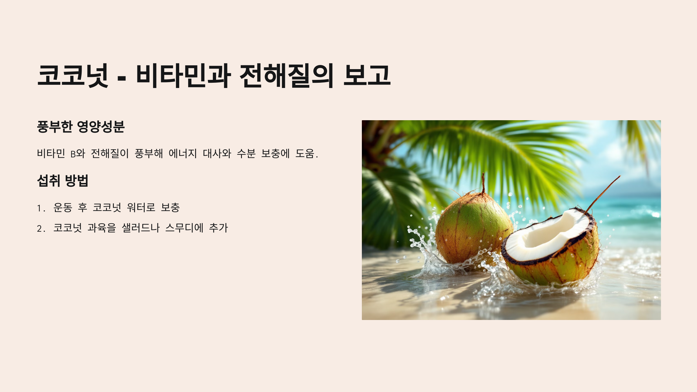 - 운동 후 코코넛 워터로 전해질과 비타민을 보충하세요.