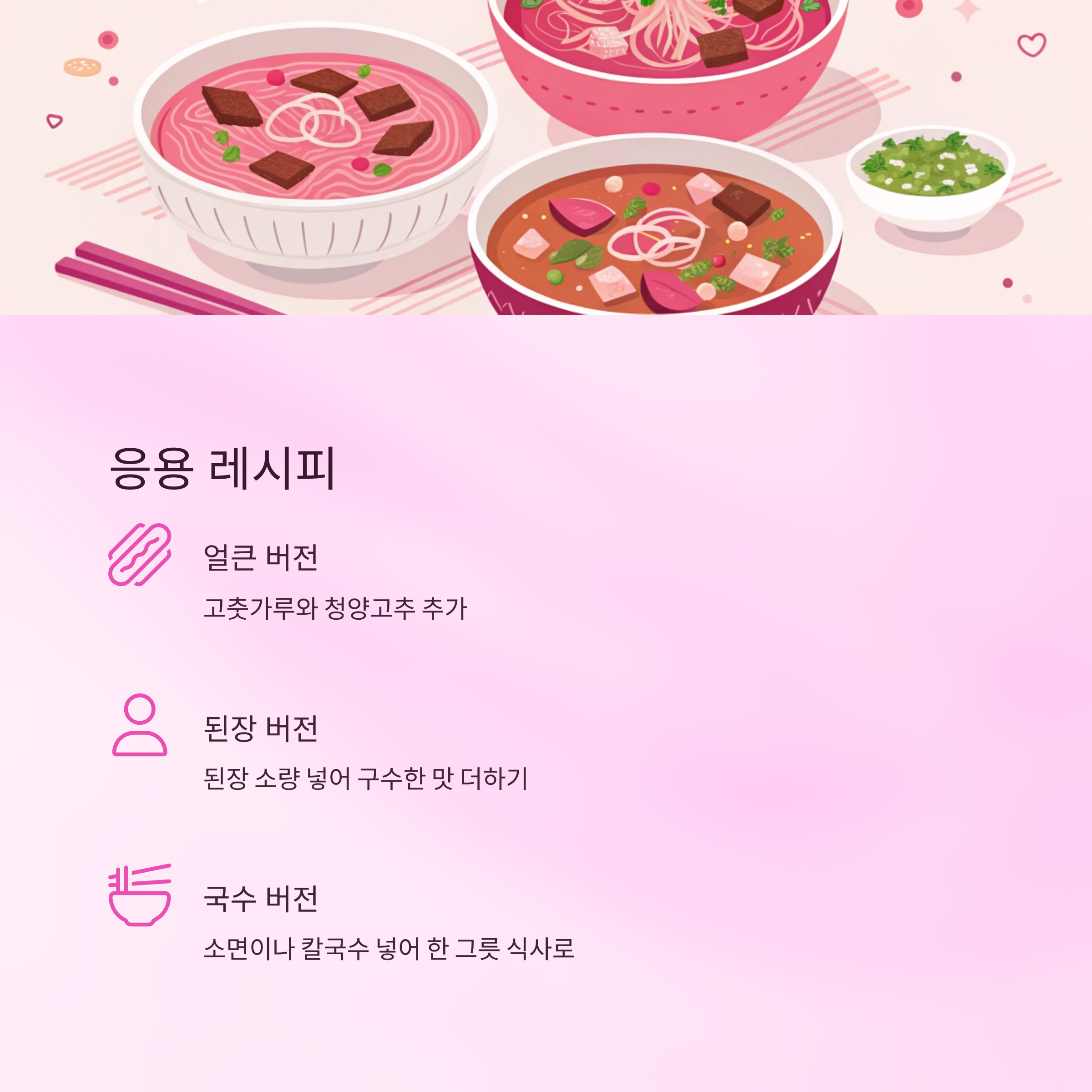 | 얼큰버전 | 고춧가루, 청양고추 | 매콤하고 칼칼한 국물 |