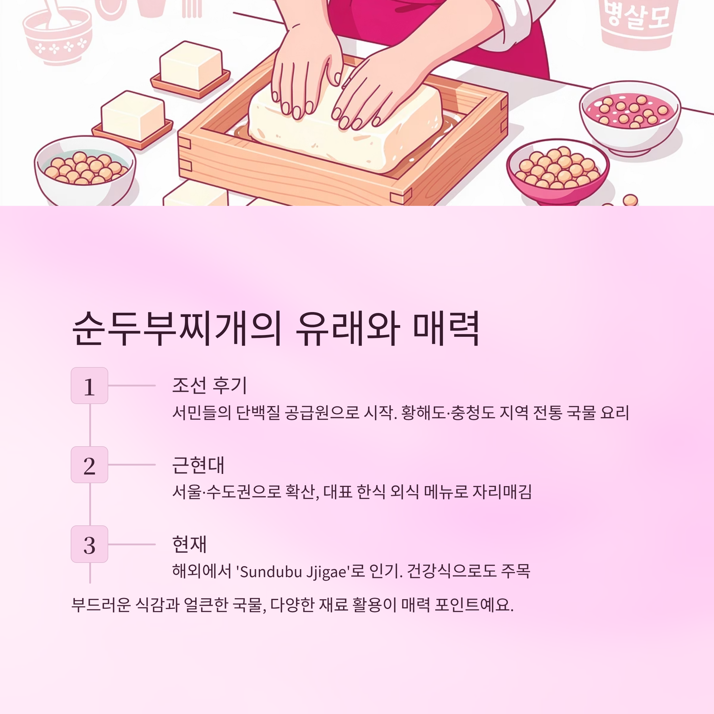 근현대에 들어서면서 순두부찌개는 서울과 수도권, 전국으로 퍼졌고, 현재는 대표적인 한식 외식 메뉴 중 하나로 자리 잡았어요. 해외에서도 'Sundubu Jjigae'로 불리며 한국 음식점에서 인기를 끌고 있죠. 얼큰한 맛과 보들보들한 식감, 다양한 재료를 활용할 수 있다는 점에서 누구나 쉽게 즐길 수 있어요.