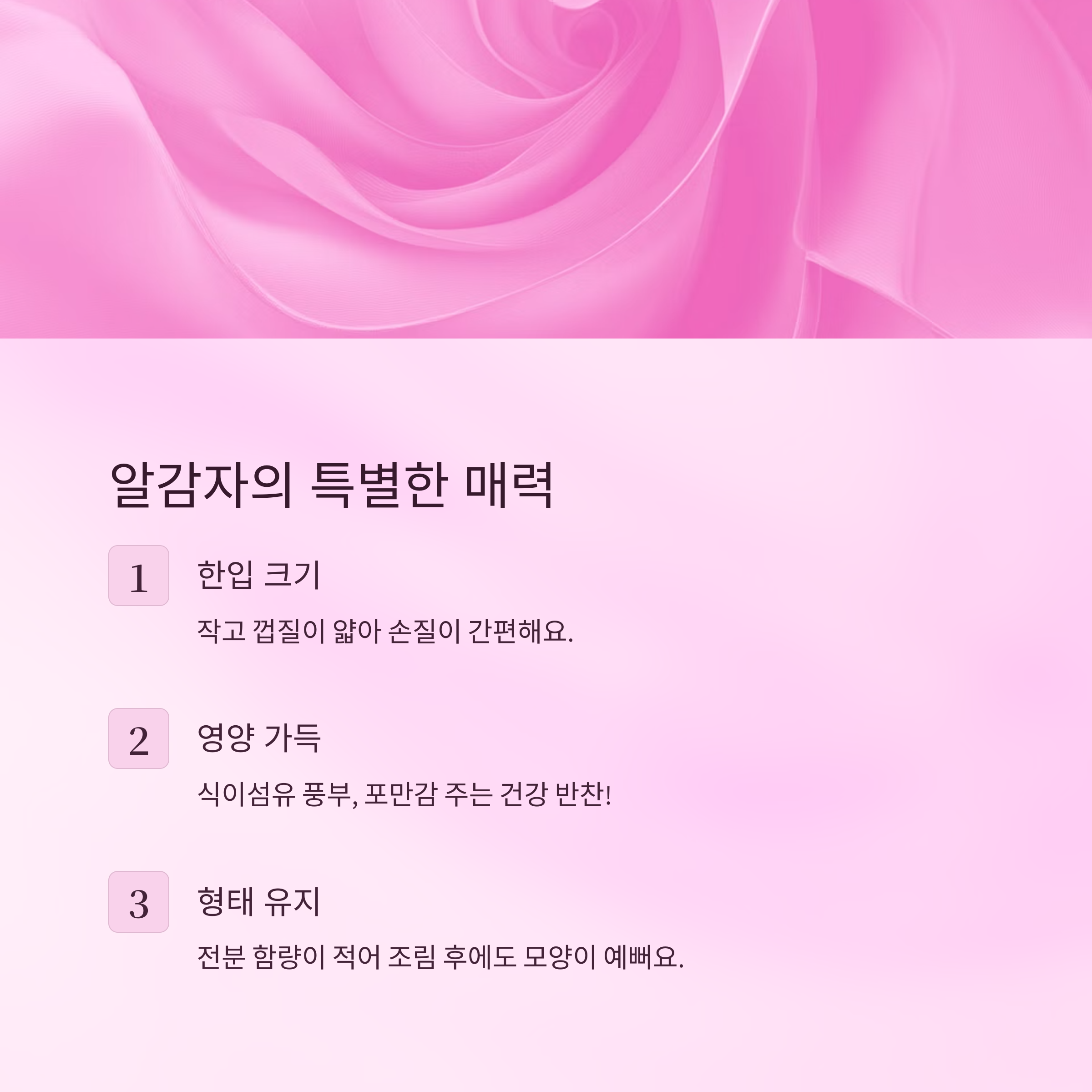 알감자는 일반 감자보다 크기가 작고, 껍질이 얇아 삶거나 조릴 때 그대로 조리해도 좋아요. 한입 크기라 별도 썰 필요 없이 조리 시간을 단축할 수 있다는 것도 큰 장점이에요. 또, 식이섬유가 풍부하고 포만감을 주는 재료라 건강한 밥상에도 잘 어울려요.
