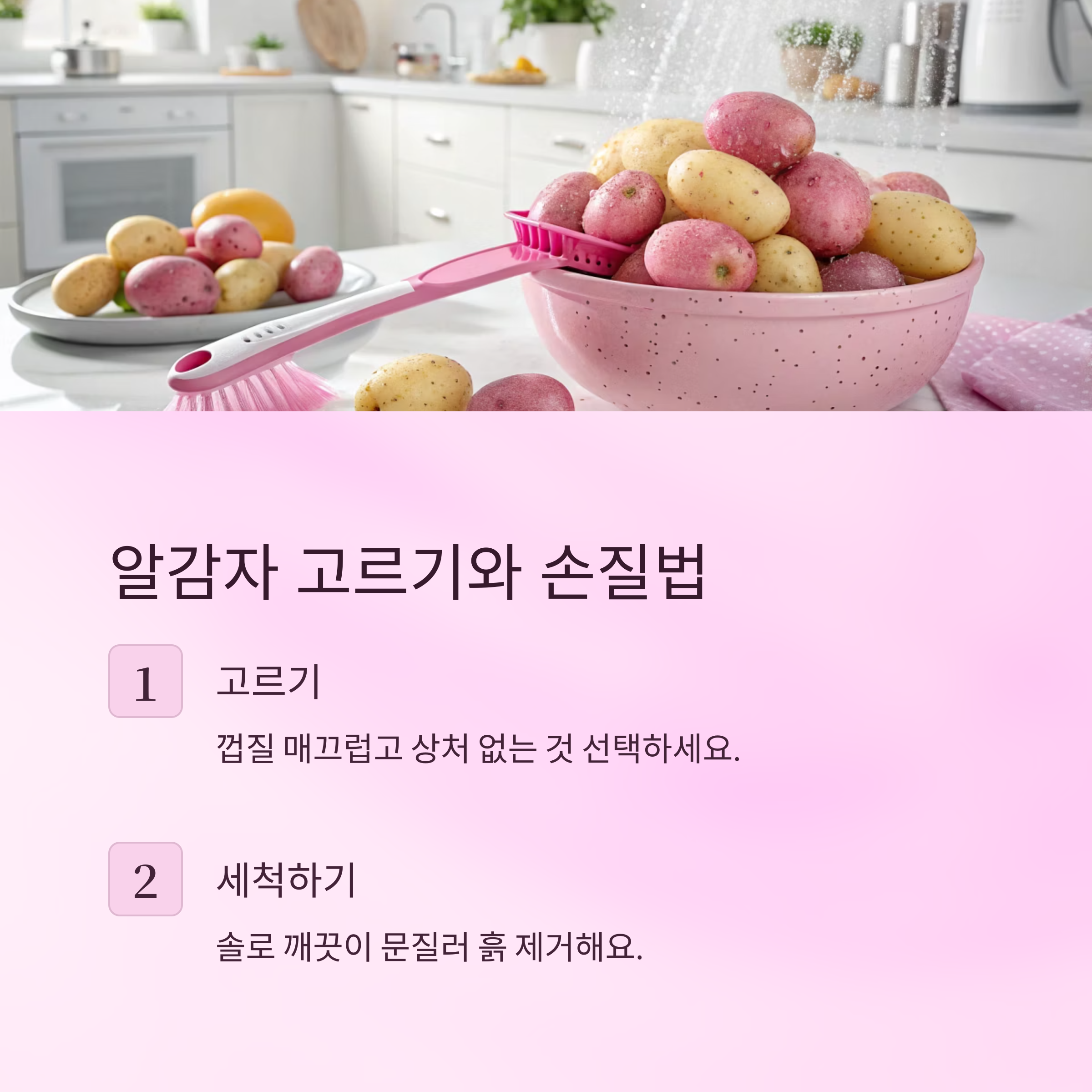 | 1단계 | 알감자 손질 | 껍질째 문질러 세척 |