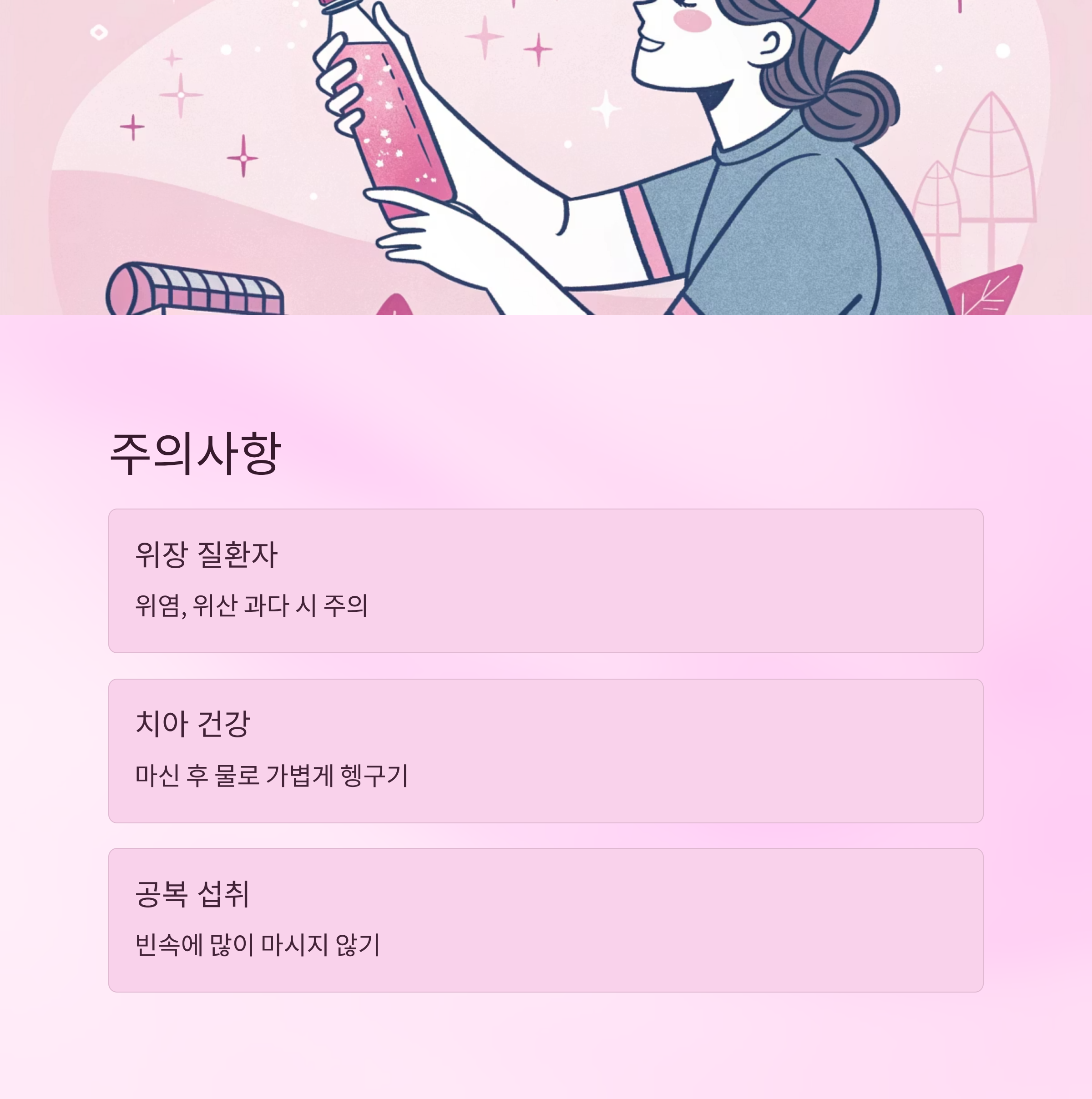 | 위염, 속쓰림 | 탄산 자극 피하기 |