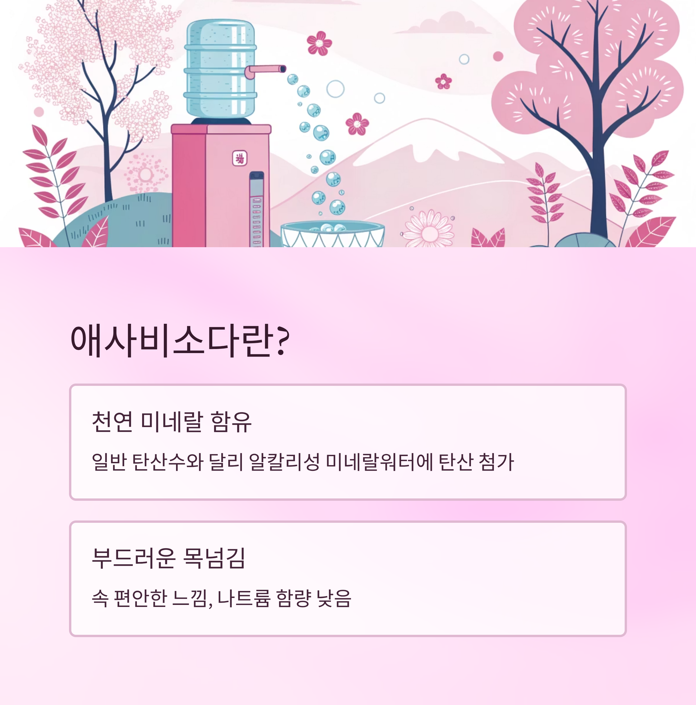 애사비소다는 일반 탄산수와 달리 천연 미네랄이 풍부하게 함유된 식이탄산수예요. 정제된 물에 이산화탄소를 주입한 기본적인 탄산수와 달리, 자연적으로 생성된 알칼리성 미네랄워터에 탄산을 더한 형태죠. 그래서 마실 때도 목 넘김이 부드럽고, 속이 편안한 느낌을 준답니다.