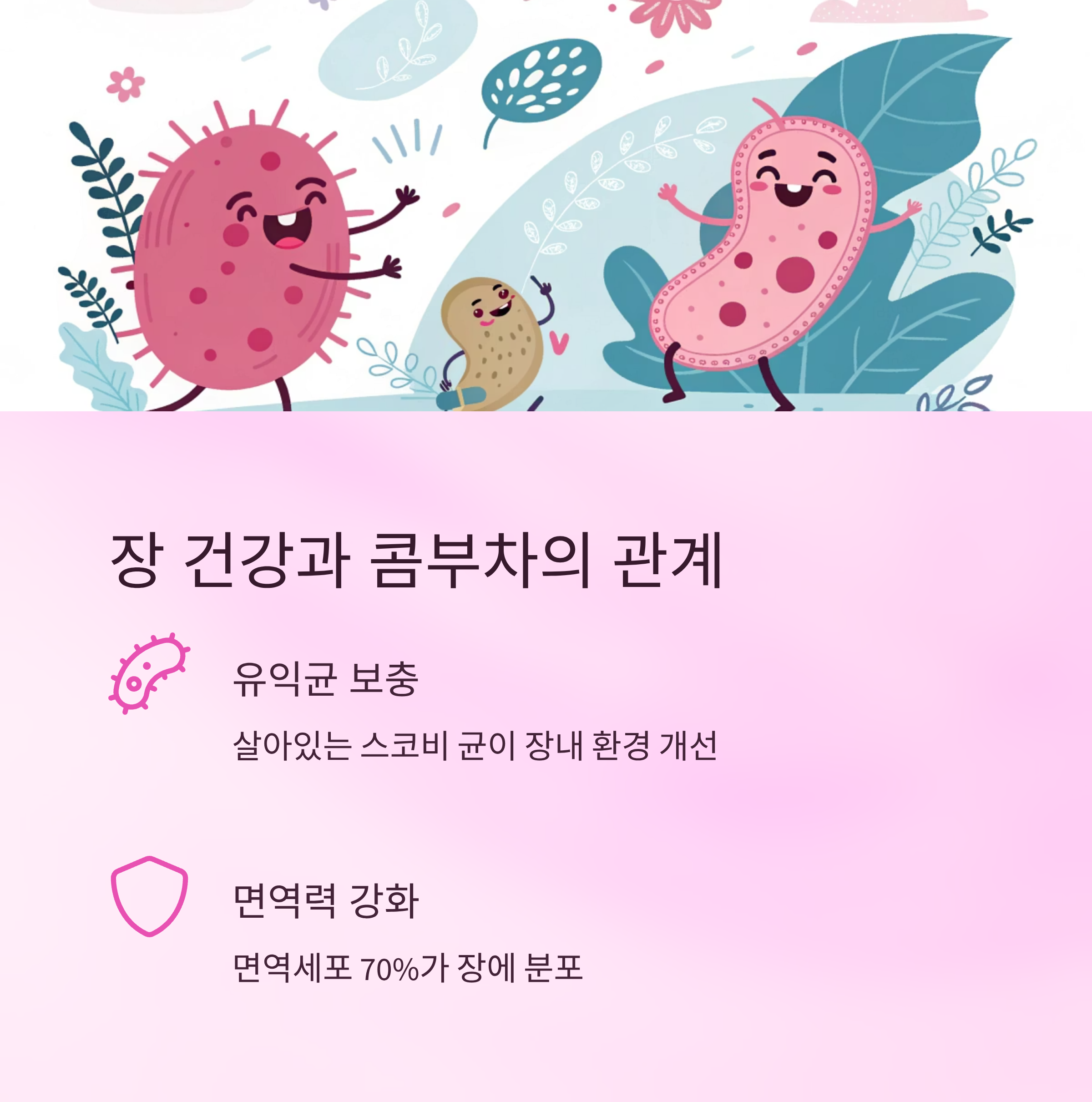 우리 몸속 장은 면역력과도 직결된 기관이에요. 전체 면역세포의 약 70%가 장에 분포해 있다고 하니, 장 건강을 챙기는 건 곧 면역력을 챙기는 일이기도 해요. 콤부차에 함유된 유기산은 장내 유해균의 증식을 억제하고, 유익균이 자라기 좋은 환경을 조성하는 데 도움을 준답니다.