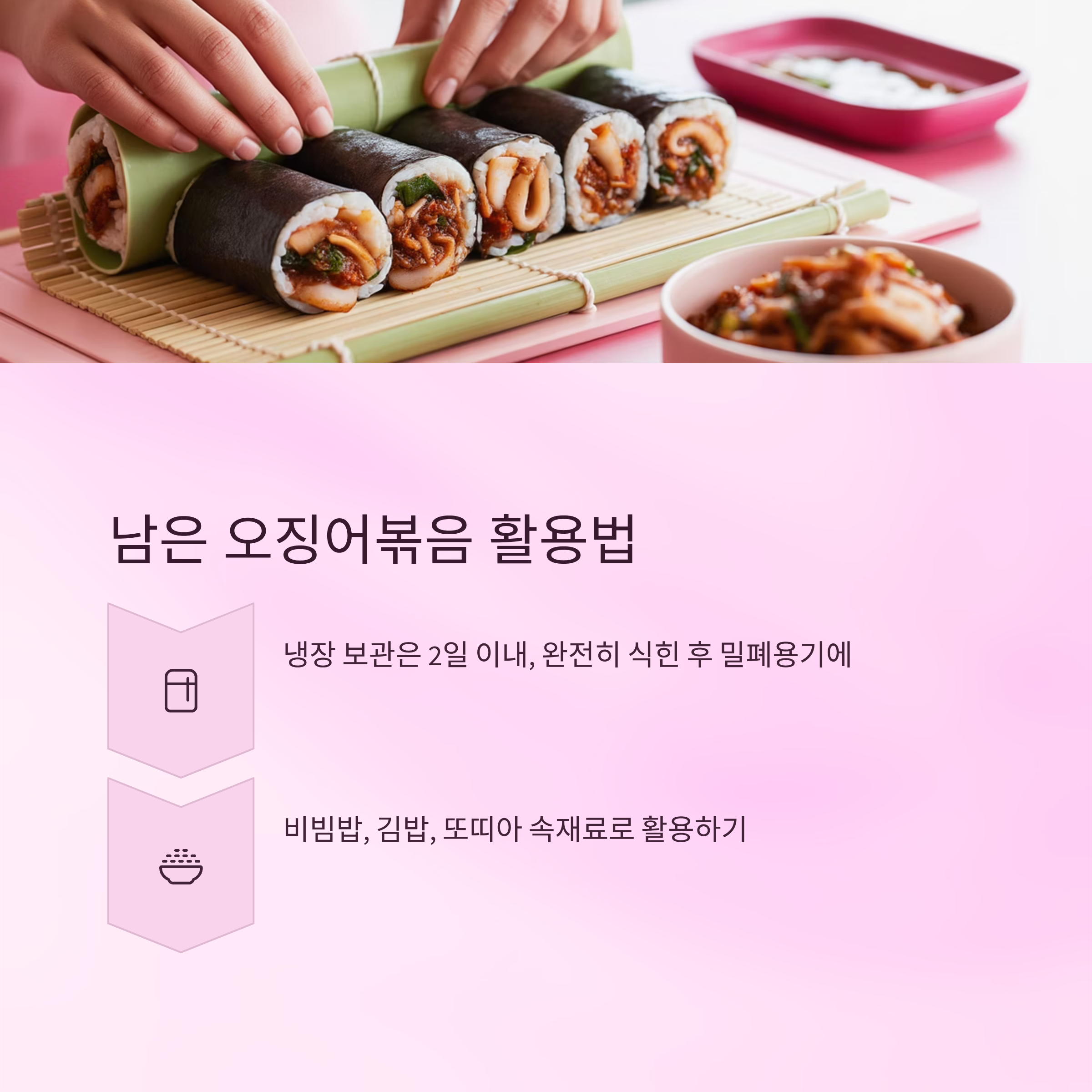 좀 더 오래 보관하고 싶다면 냉동 보관도 가능해요. 다만 오징어 특성상 해동 후 식감이 다소 질겨질 수 있어요. 그래서 덮밥이나 비빔밥 용도로 쓰면 좋고, 김밥 재료로도 재활용할 수 있어요.