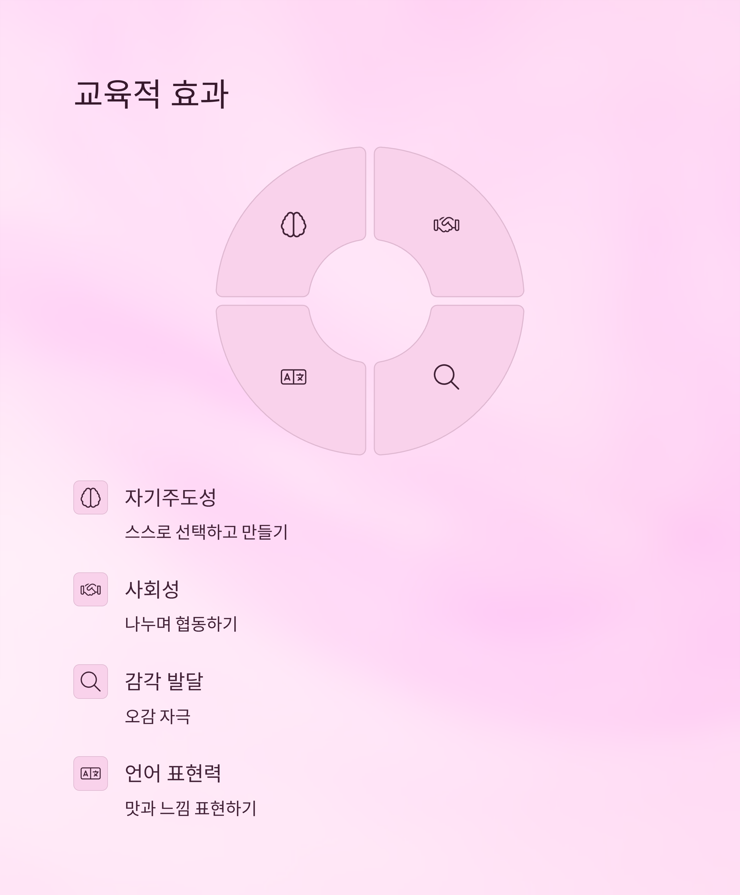 | 감각 발달 | 오감을 자극하는 재료 활용 | 촉감 놀이 병행 |