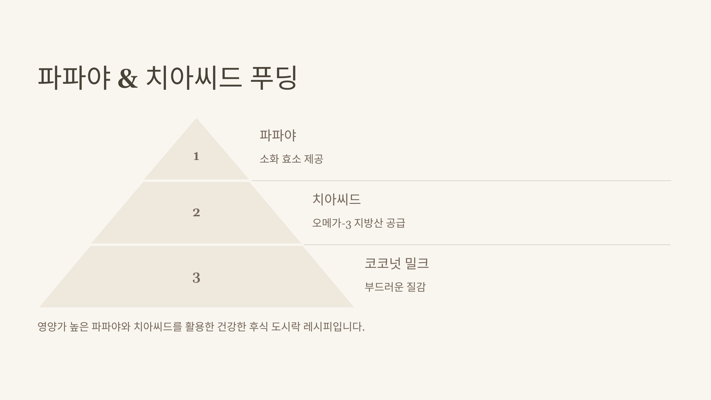 - 효능: 파파야의 소화 효소가 위 건강을 돕고, 치아씨드가 오메가-3 지방산을 공급하며 포만감을 유지합니다.