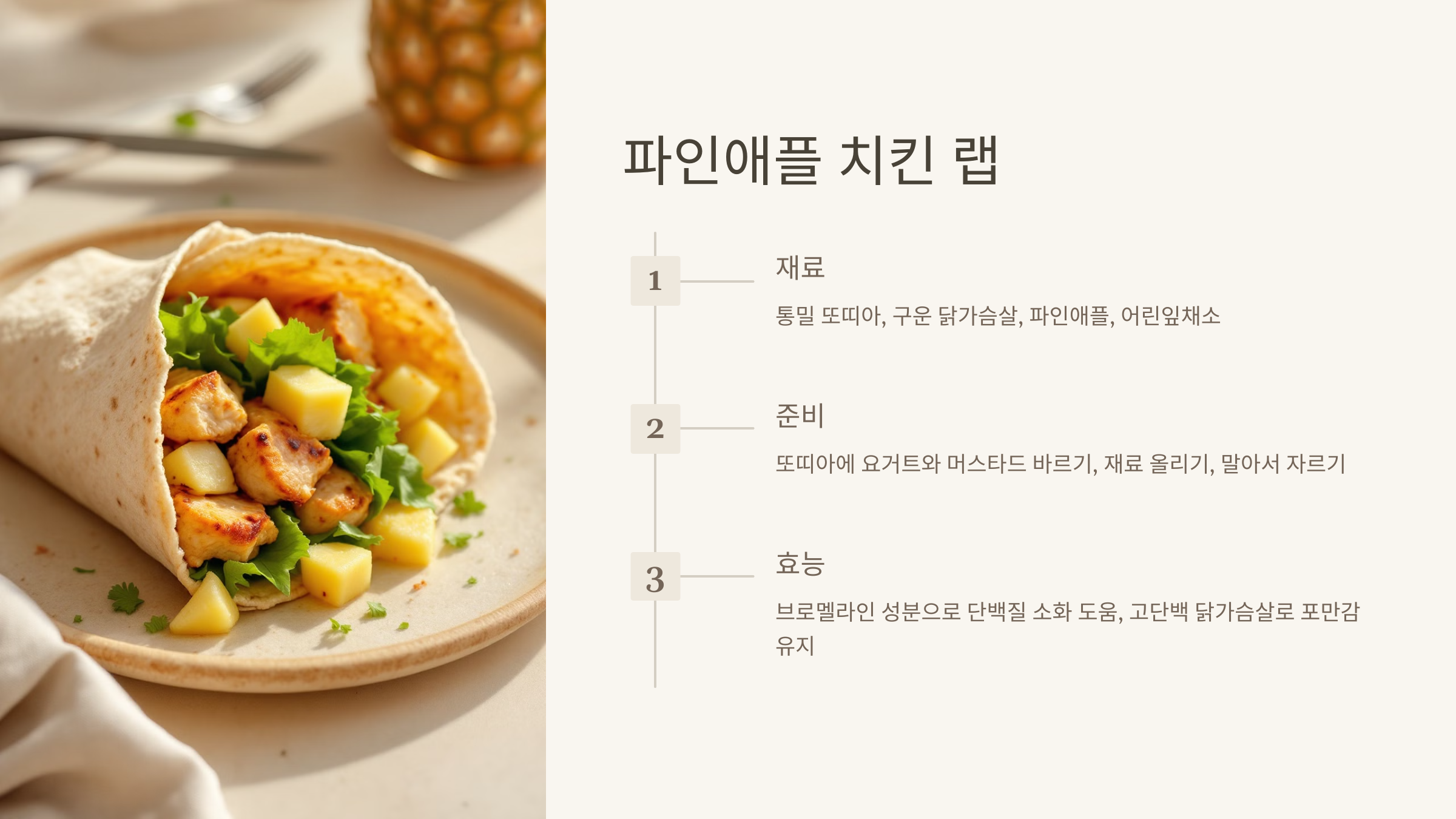 - 효능: 파인애플의 브로멜라인 성분이 단백질 소화를 돕고, 닭가슴살의 고단백 성분이 포만감을 오래 유지합니다.