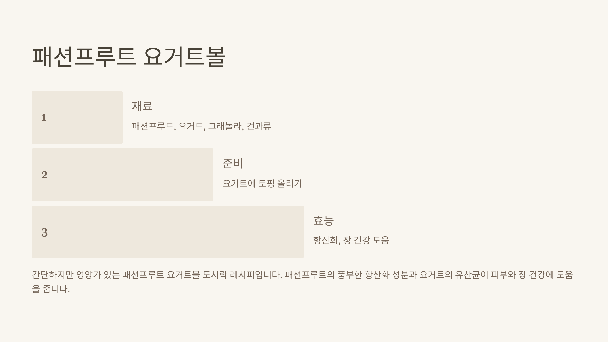 - 효능: 패션프루트의 항산화 성분과 요거트의 유산균이 피부 건강과 장 건강에 도움을 줍니다.