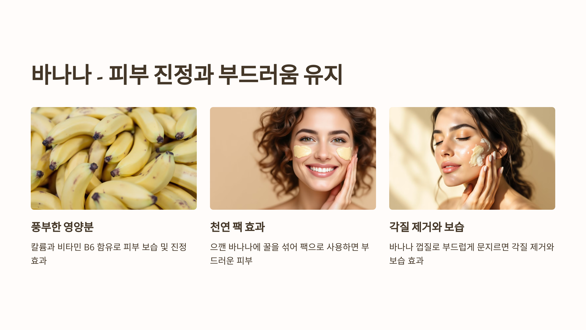 바나나는 풍부한 칼륨과 비타민 B6를 함유하고 있어 피부를 촉촉하고 부드럽게 만들어줍니다. 또한 항염 효과가 있어 피부 진정에도 좋으며, 자연스럽게 피부 톤을 정돈하는 데 도움을 줍니다.