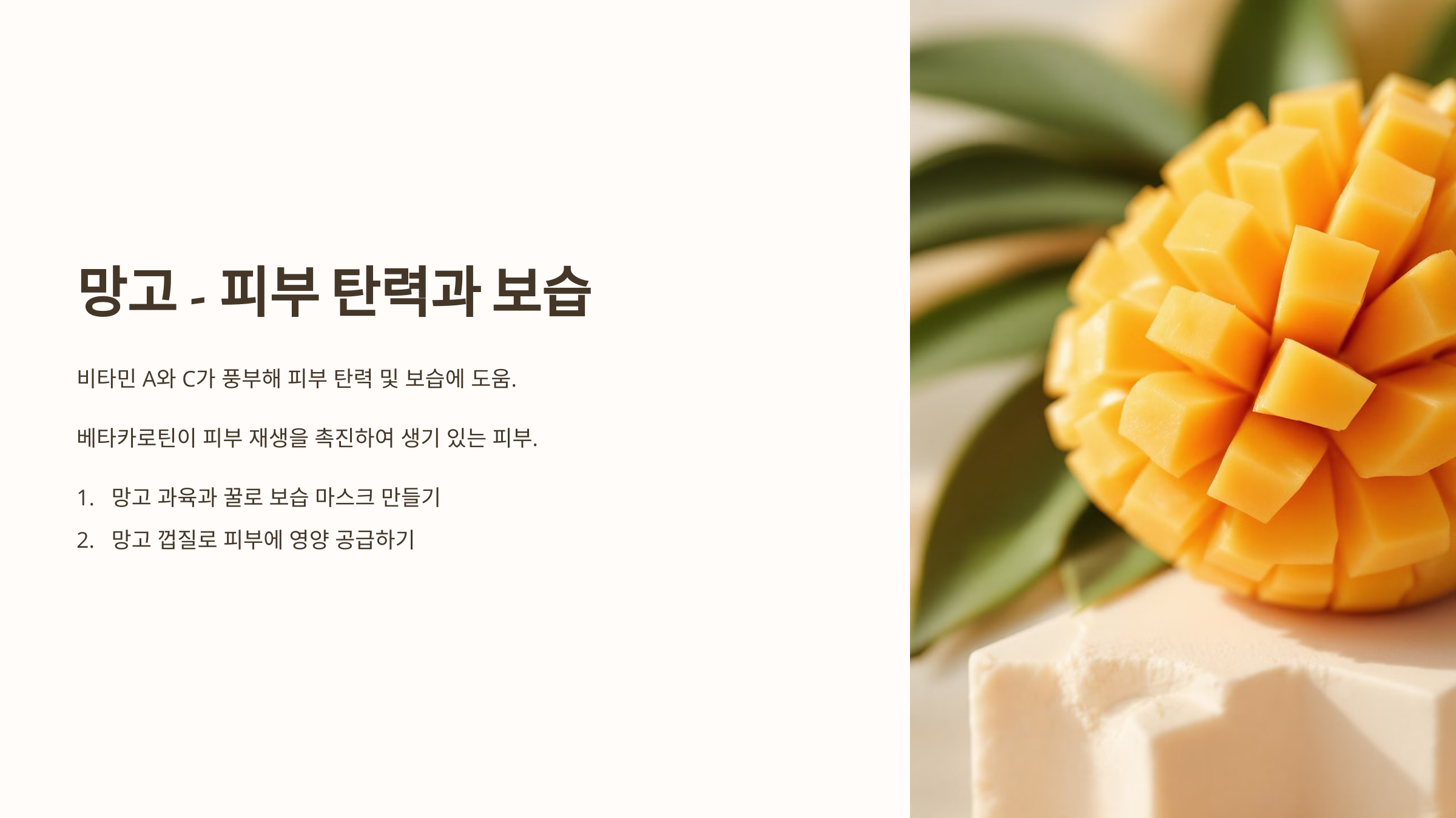 망고에는 비타민 A와 C가 풍부해 피부에 탄력을 부여하고 보습에 도움을 줍니다. 또한 망고의 베타카로틴 성분이 피부의 자연적인 재생을 도와 피부를 밝고 생기 있게 만들어줍니다.