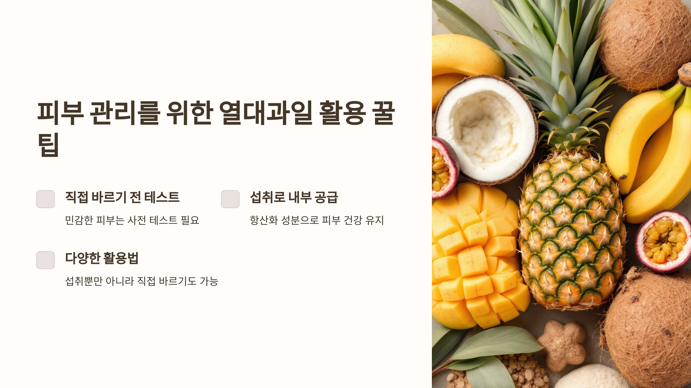 열대과일은 직접 섭취하는 것도 좋지만, 피부에 바로 사용할 수도 있습니다. 다만, 민감한 피부라면 과일을 직접 바르기 전에 팔 안쪽 등에 소량 테스트를 통해 자극이 없는지 확인하세요. 또한 꾸준한 열대과일 섭취는 항산화 성분을 체내에 공급해주기 때문에 피부를 건강하고 탄력 있게 유지하는 데 큰 도움이 됩니다.
