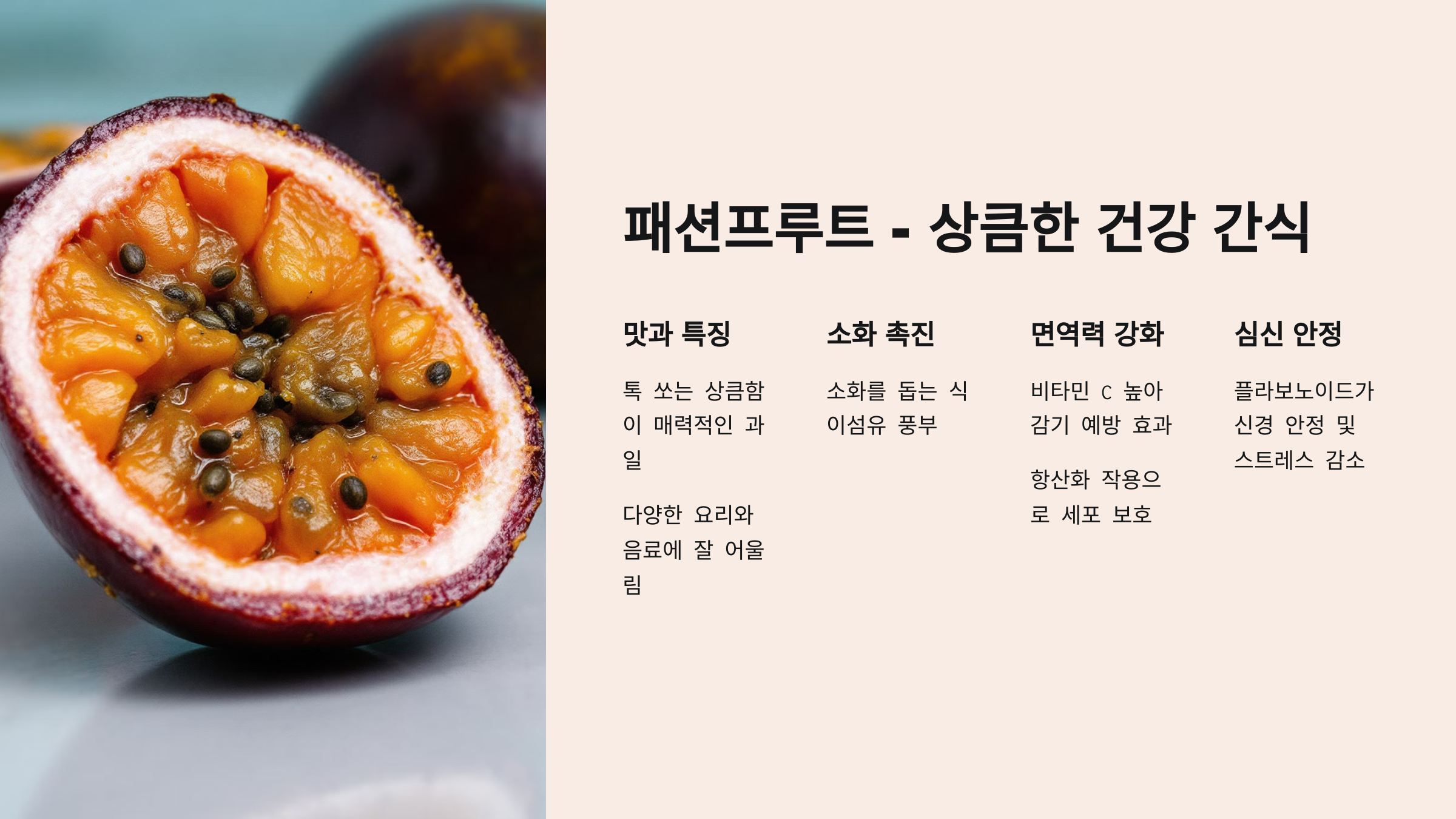 - 소화 촉진: 패션프루트에는 소화를 돕는 식이섬유가 풍부하게 함유되어 있습니다.
