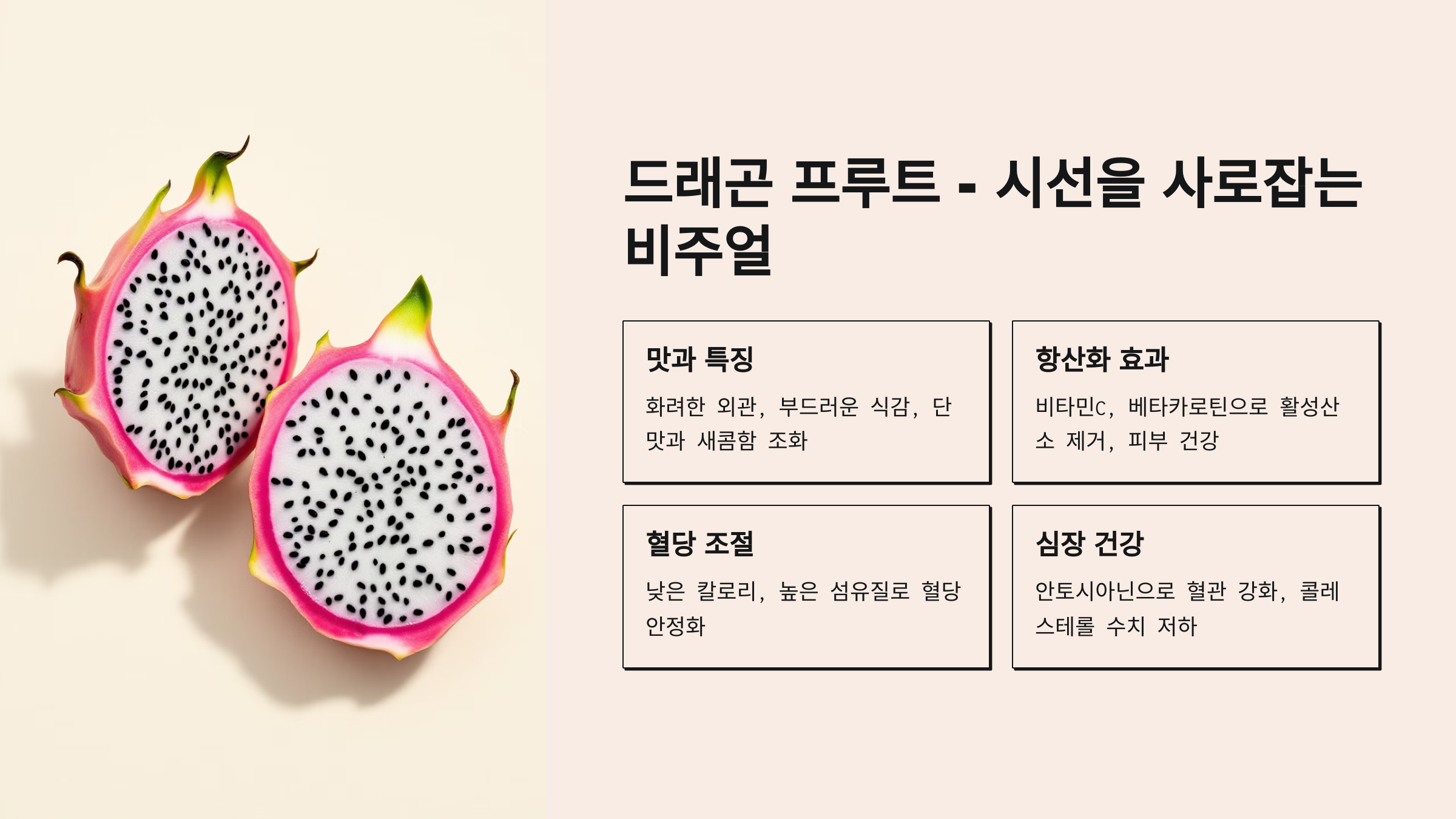 맛과 특징: 화려한 외관과 부드러운 식감이 특징인 드래곤 프루트는 약간의 단맛과 새콤함이 조화를 이루는 과일입니다.