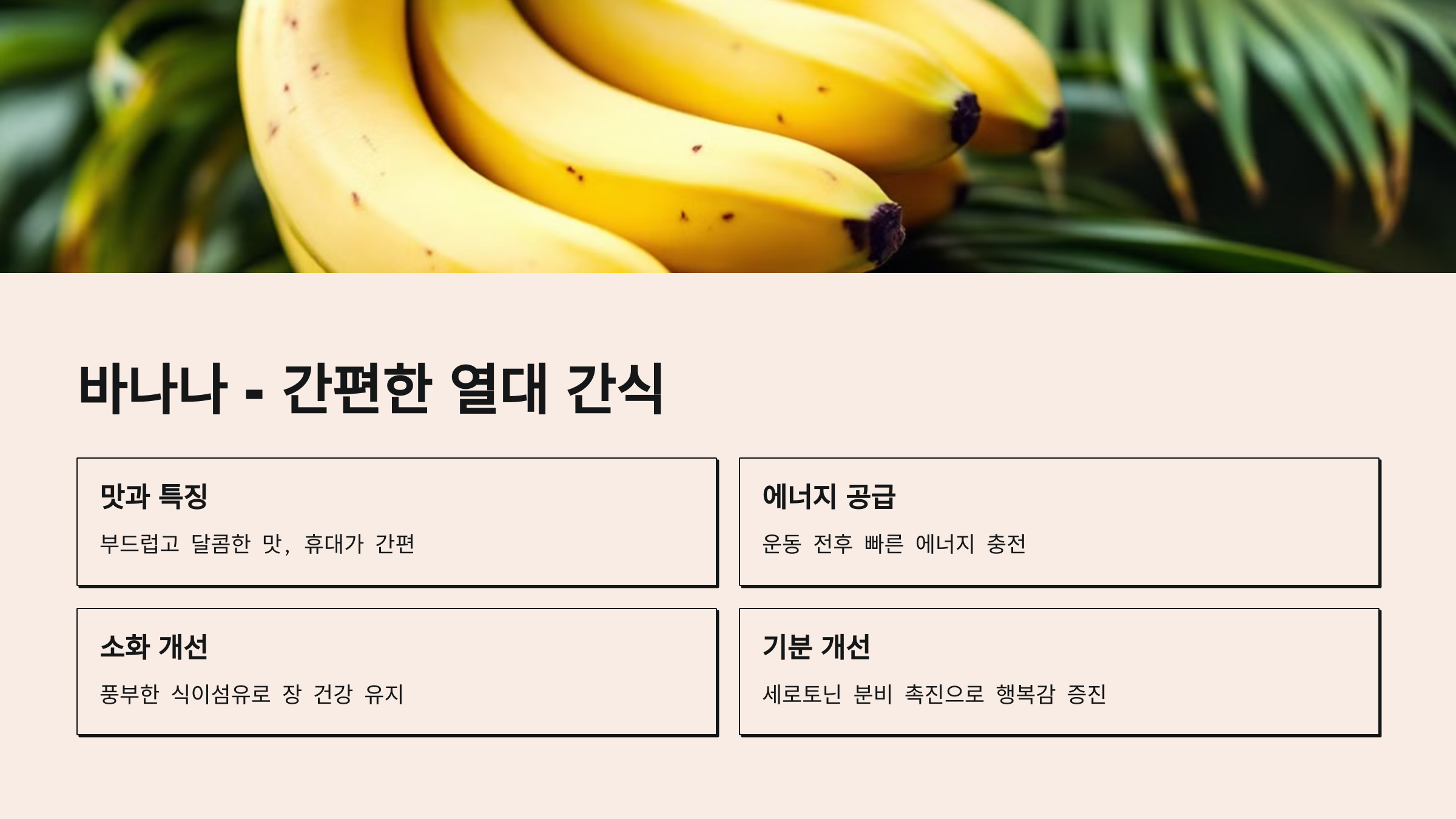 맛과 특징: 바나나는 부드럽고 달콤한 맛으로 누구나 쉽게 먹을 수 있는 과일입니다. 특히 휴대가 간편해 언제 어디서든 간편하게 섭취할 수 있습니다.