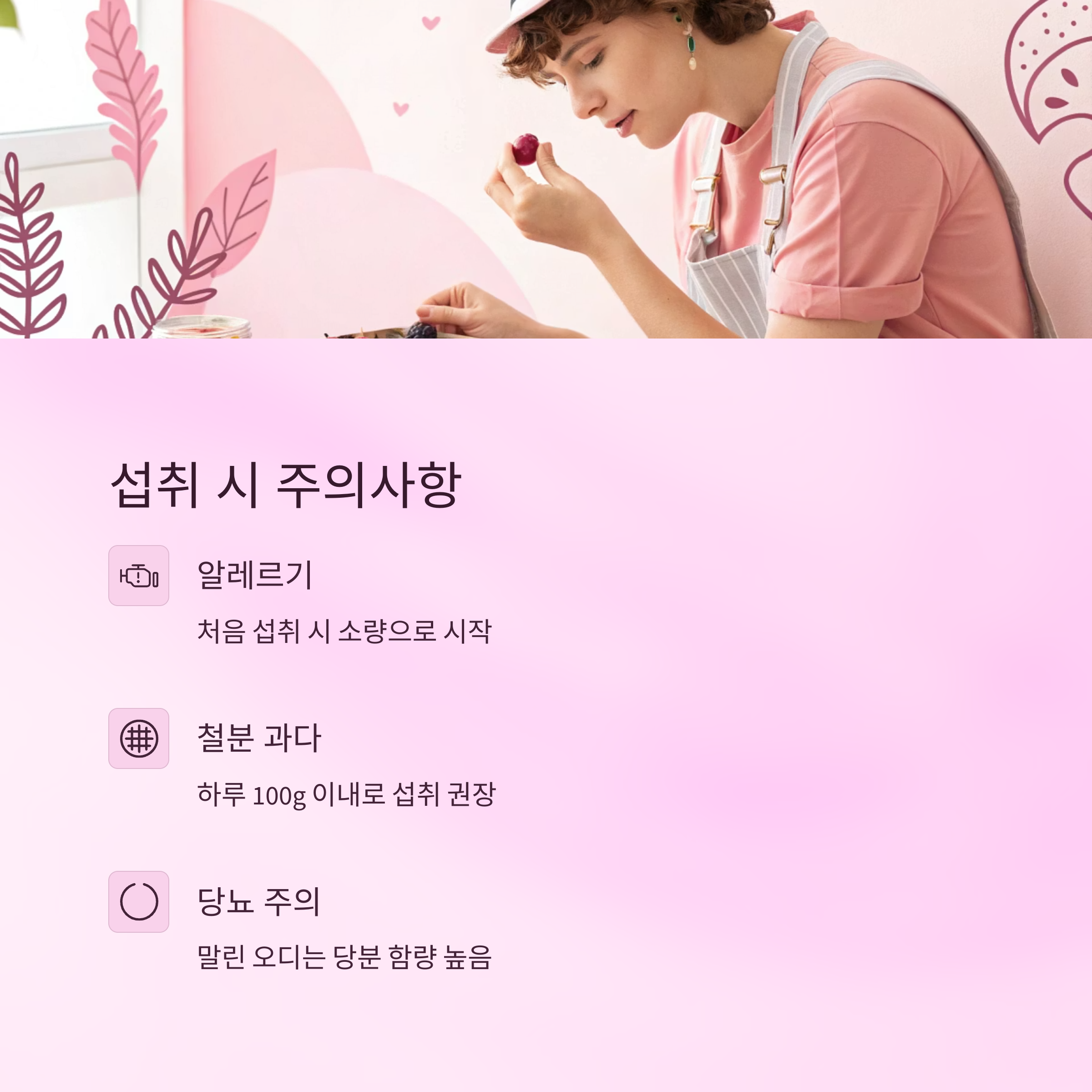 요즘에는 오디를 원료로 한 건강보조식품도 많이 나와 있어서 꾸준한 섭취가 가능해졌어요. 단, 고열에 장시간 조리하면 유효성분이 파괴될 수 있으니 가능한 한 생으로 또는 저온에서 섭취하는 것이 좋아요.