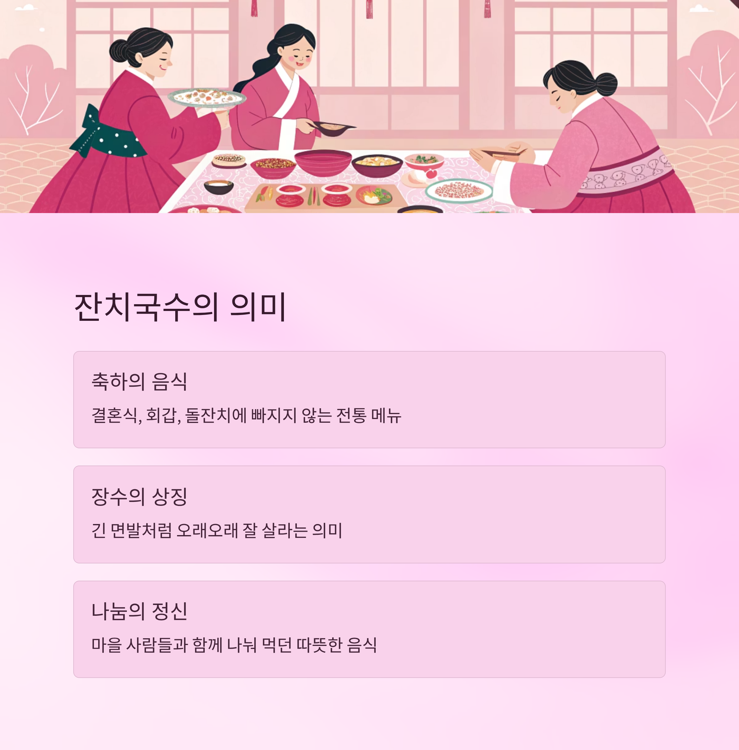 잔치국수는 말 그대로 ‘잔치’에 빠지지 않고 등장하는 국수예요. 결혼식, 회갑잔치, 환갑, 돌잔치, 심지어는 마을 잔치에도 등장할 만큼 한국인의 축제 음식으로 자리잡았어요. 국수를 길게 뽑는 모양처럼 오래오래 잘 살라는 뜻을 담기도 하고, 따뜻한 국물로 마음을 나누는 음식으로도 알려져 있죠.