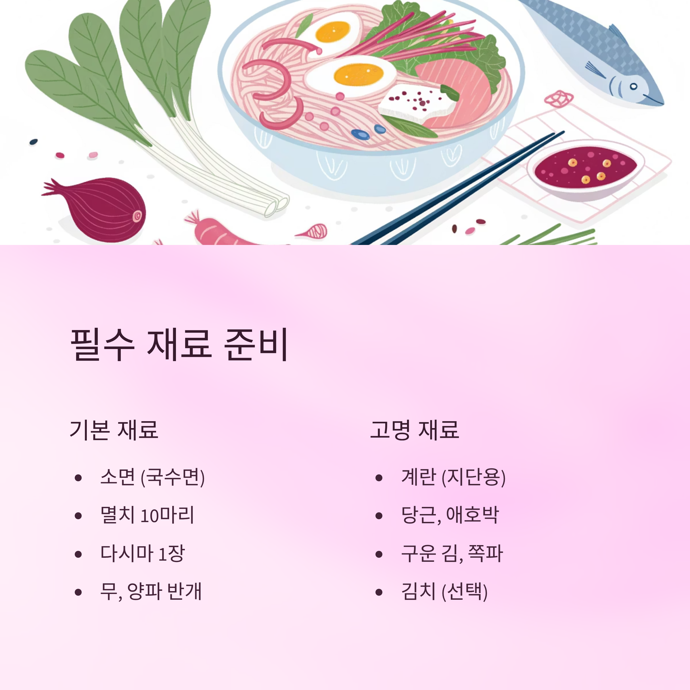 잔치국수를 만들기 위해 필요한 재료는 아주 기본적이에요. 국수면, 다시마, 멸치, 간장, 소금, 계란, 김, 당근, 애호박 정도만 있으면 충분하죠. 이 정도는 대부분 냉장고에 있는 식재료라 부담 없이 시작할 수 있어요.