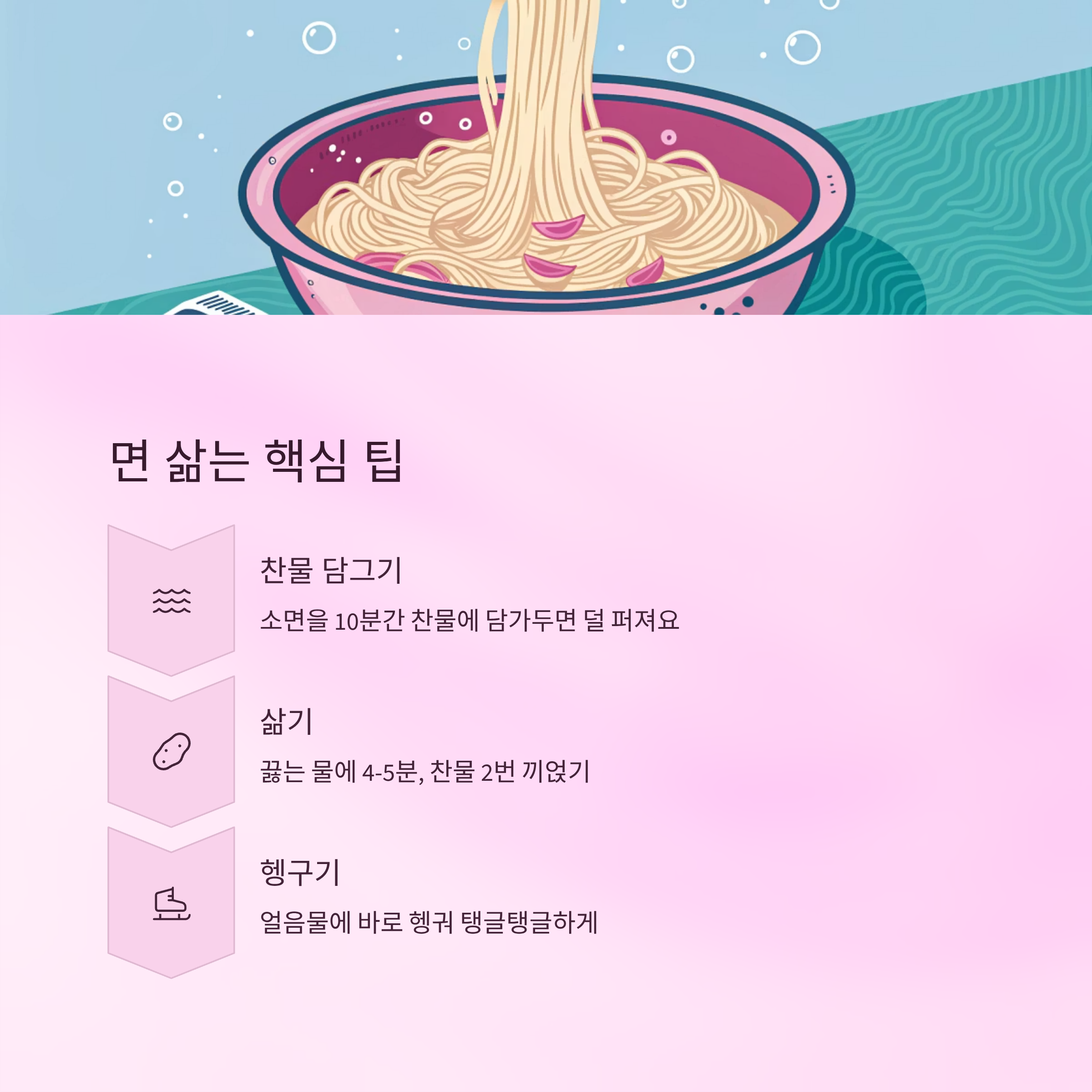 국수는 면 삶는 게 반이에요. 아무리 육수가 맛있고 고명이 예뻐도 면이 퍼지면 모든 게 망치기 쉽죠. 소면은 찬물에 10분 정도 담가놓으면 삶을 때 덜 퍼지고 쫄깃한 식감을 유지할 수 있어요.