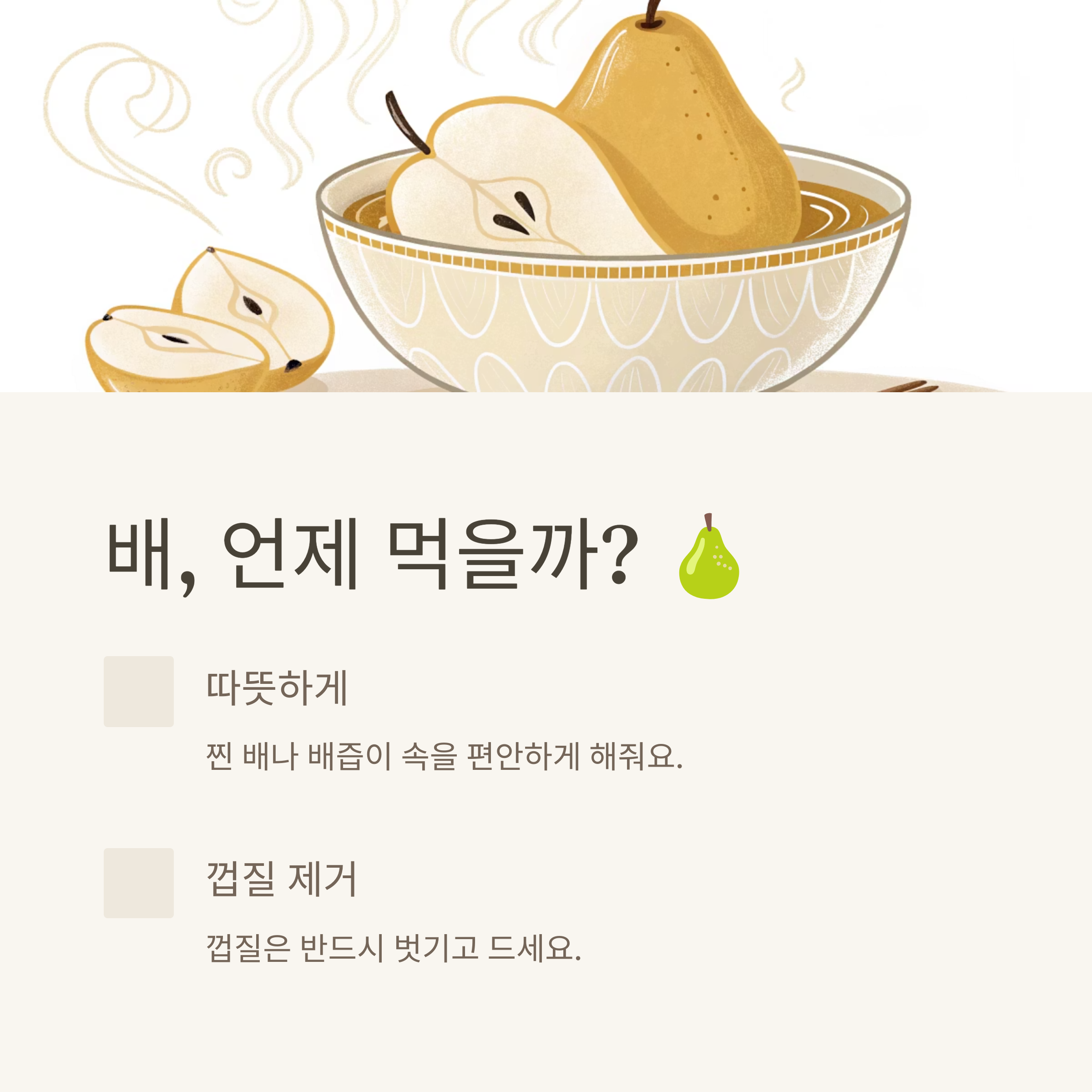 단, 차가운 배나 껍질째 먹는 것은 장염 증상을 악화시킬 수 있어요. 가능하면 껍질을 벗기고 데워서 먹는 것이 핵심이에요.