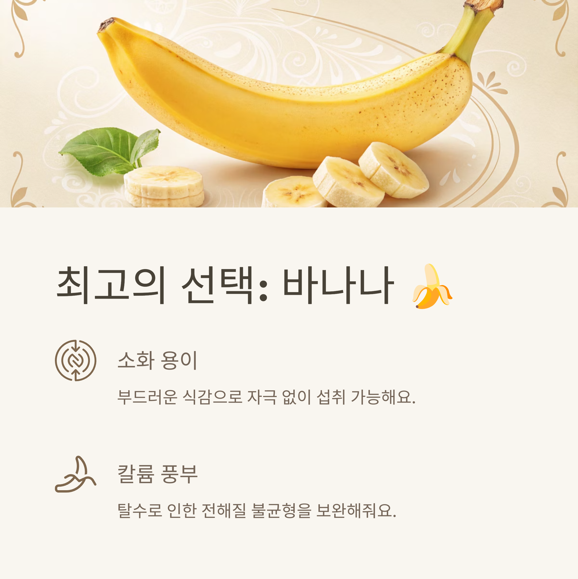 A1. 바나나가 가장 추천돼요. 소화가 쉽고 전해질 균형에 도움이 되거든요.