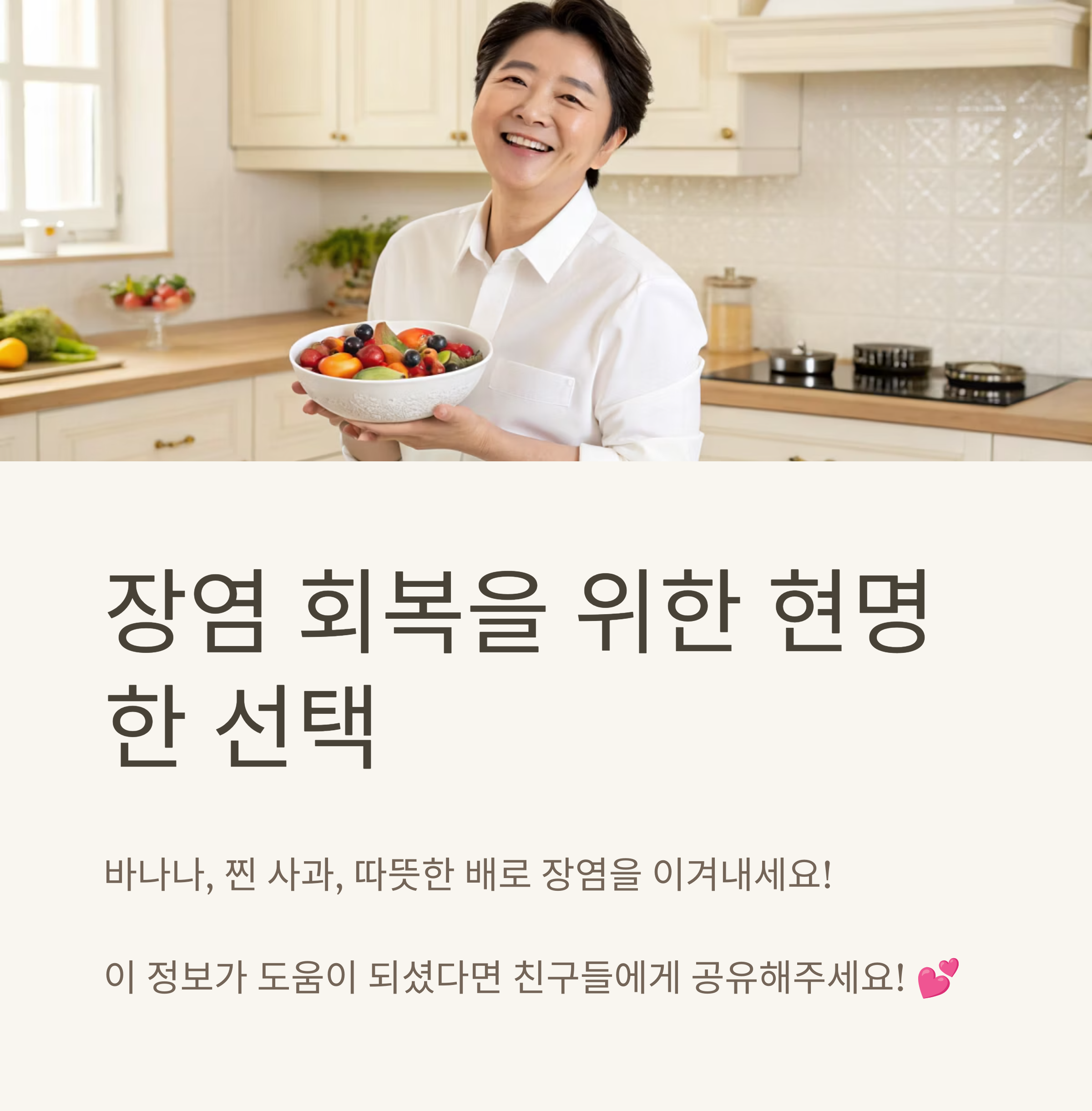 배는 수분이 풍부해서 탈수가 쉬운 장염 상태에 매우 적합해요. 특히 따뜻하게 찐 배는 목과 장을 동시에 보호해주는 역할을 하죠. 생으로 먹기보다 껍질을 제거하고 조리해 먹는 게 훨씬 좋아요.