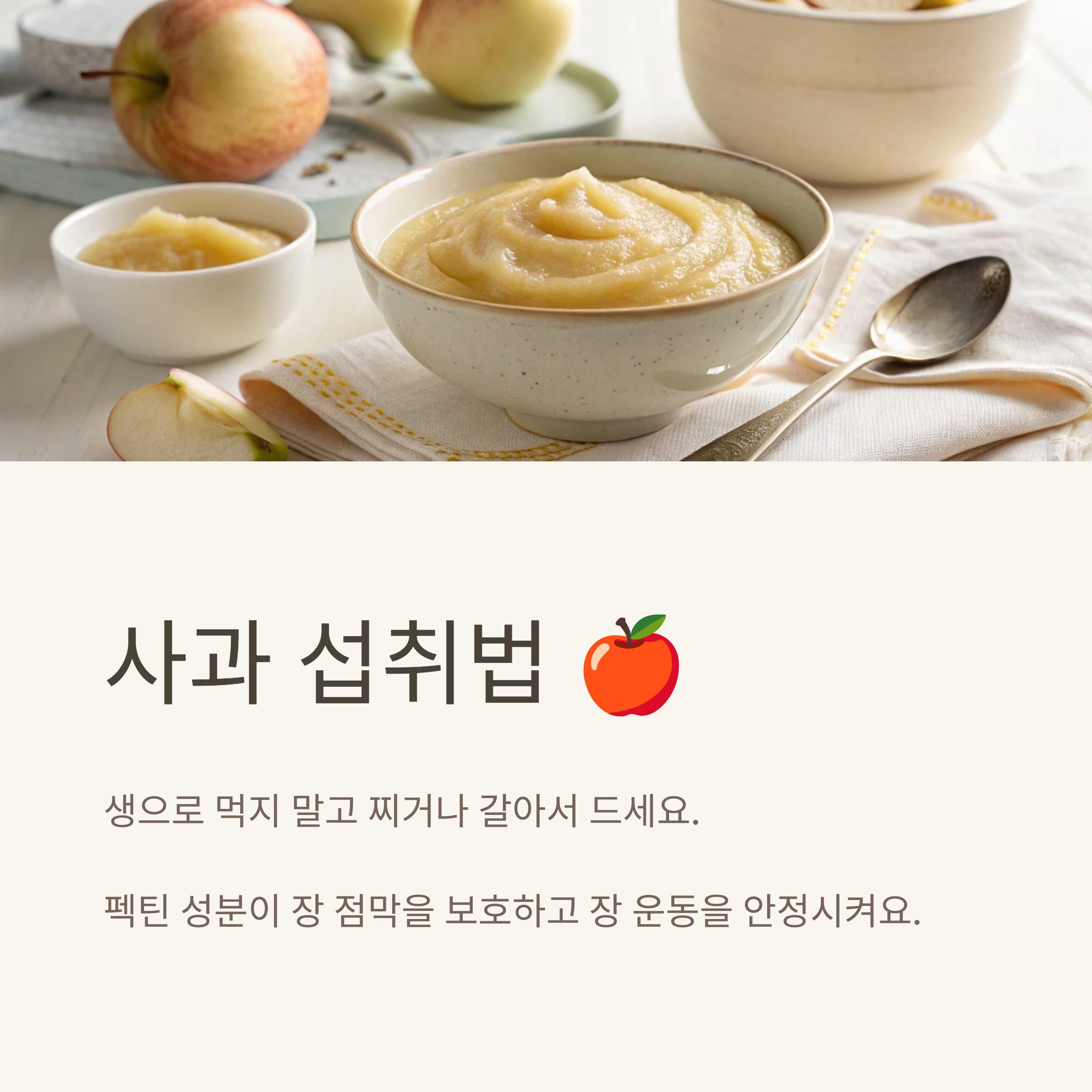 사과에 들어 있는 펙틴 성분은 장 점막을 보호하고, 장 운동을 안정시키는 데 효과적이에요. 특히 삶아서 퓌레 형태로 만든 사과는 아이들부터 어르신까지 부담 없이 먹을 수 있어요.