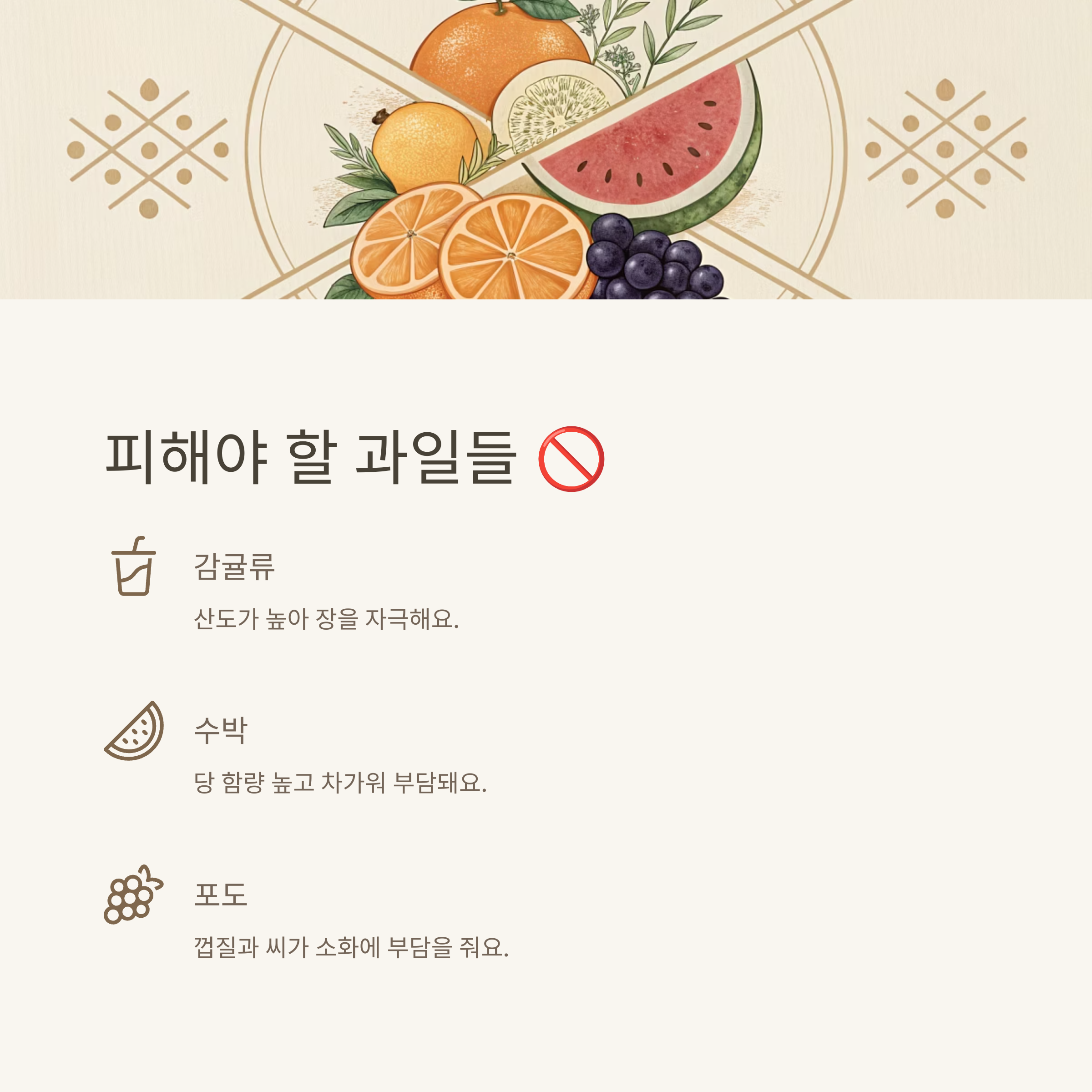 장염일 때는 피해야 할 과일도 분명 있어요. 대표적으로 감귤류(오렌지, 귤 등)는 산도가 높아 장을 자극할 수 있어요. 특히 위산이 민감한 상태에서는 이런 과일이 통증을 유발할 수 있죠.