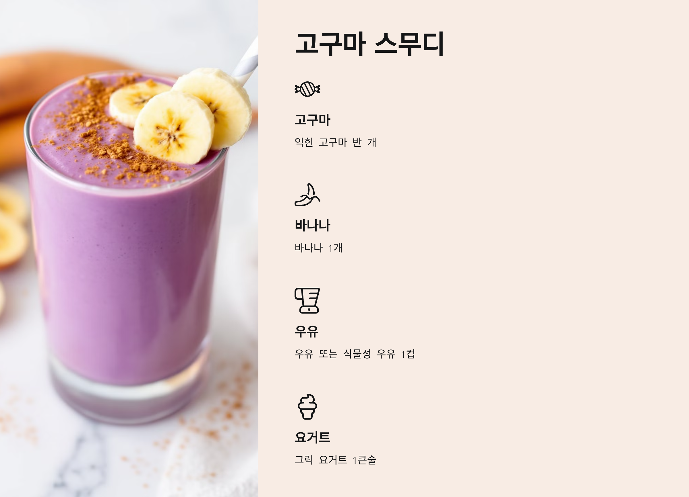 - 믹서에 넣기: 고구마, 바나나, 우유, 그릭 요거트를 모두 믹서에 넣고 부드럽게 갈아줍니다.