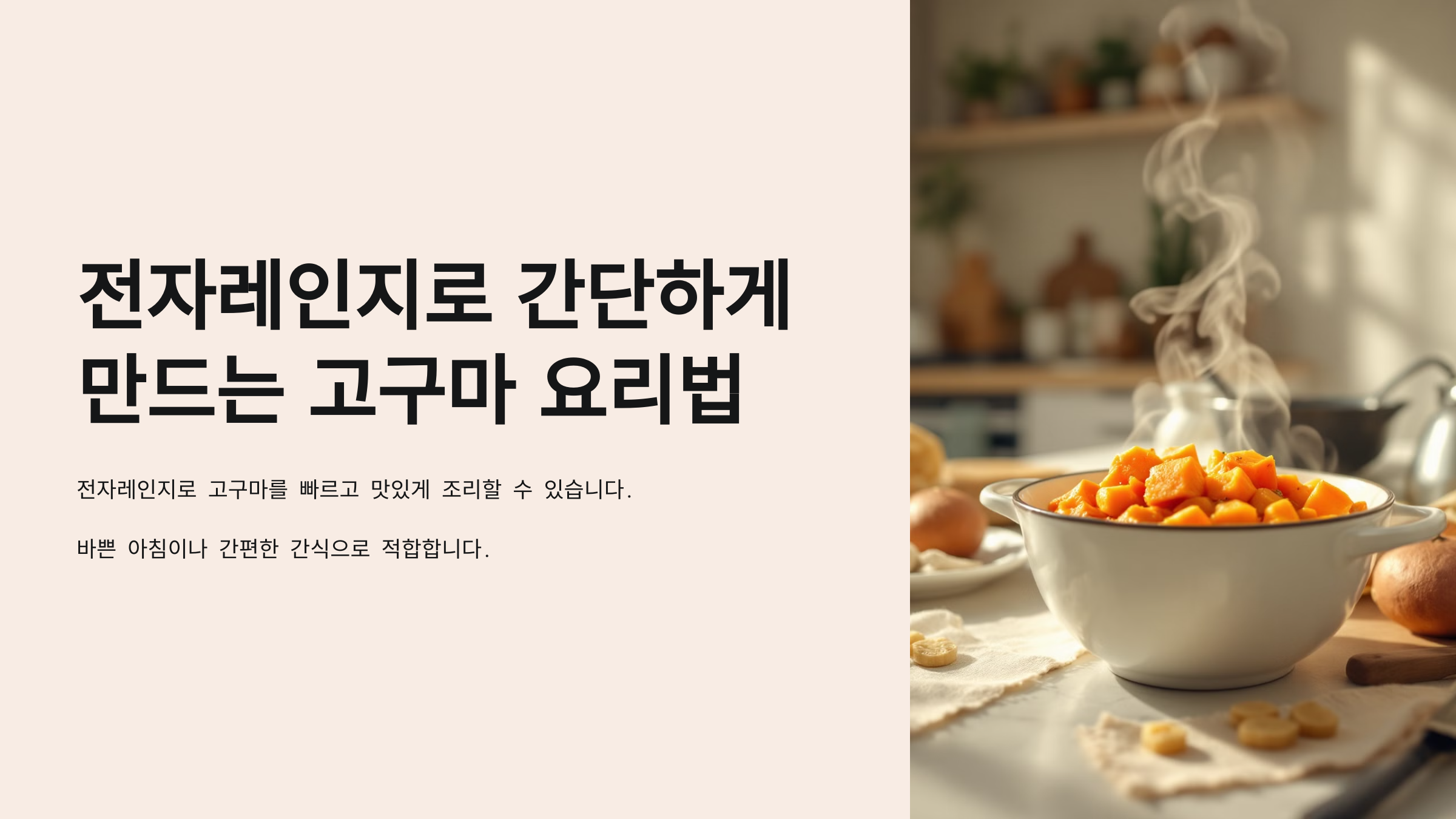 전자레인지를 활용하면 고구마 요리를 간단하고 빠르게 만들 수 있습니다. 찐 고구마부터 치즈볼, 스무디까지 다양한 방법으로 고구마를 활용해 보세요. 칼로리가 낮고 영양이 풍부해 다이어트 간식으로도 좋으며, 손쉽게 즐길 수 있는 고구마 요리로 건강한 간식을 만드세요! 😊