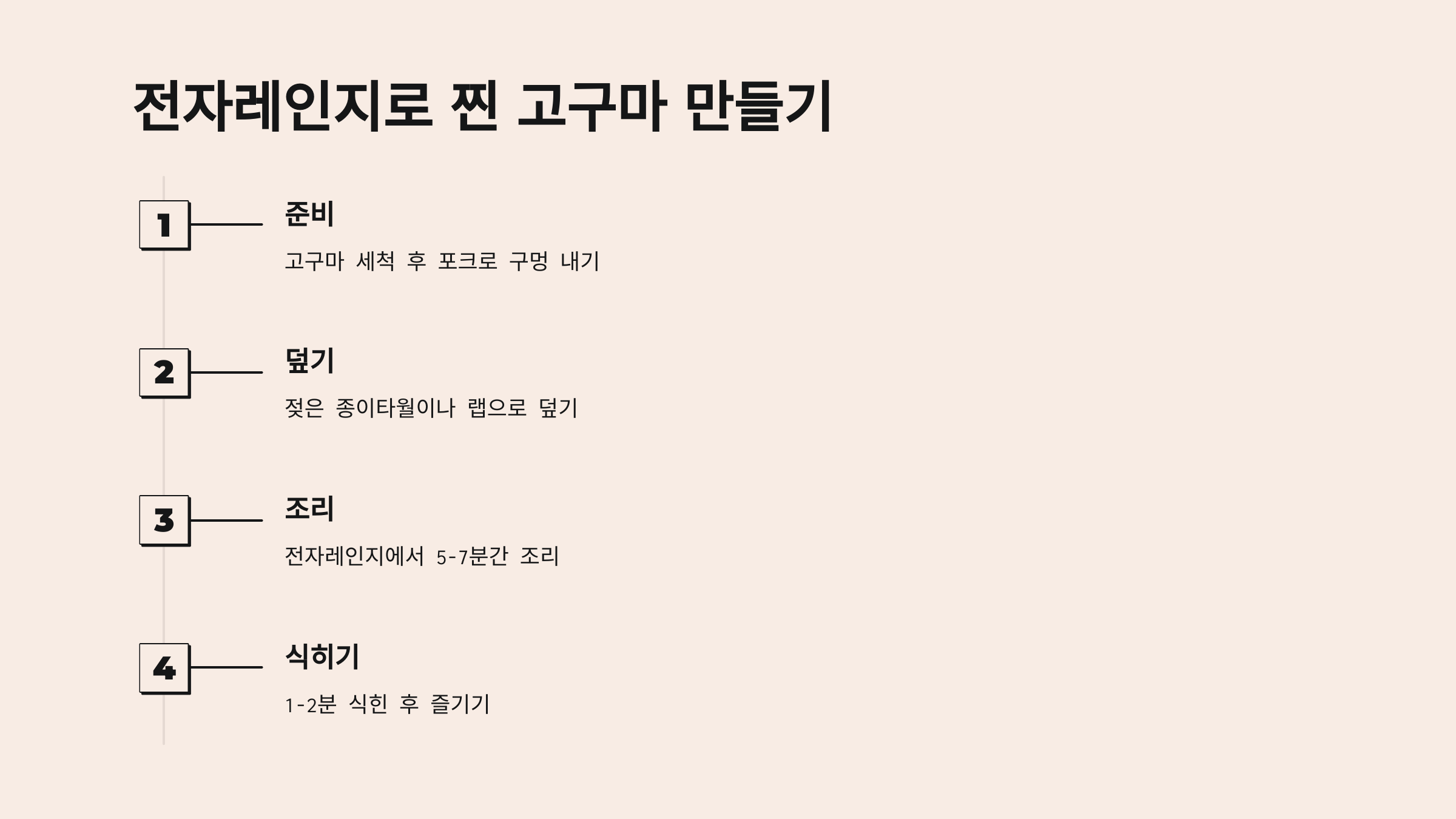 - 전자레인지 조리: 전자레인지에서 5~7분간 돌립니다. 고구마의 크기에 따라 시간이 달라질 수 있으니 중간에 익었는지 확인해 주세요.