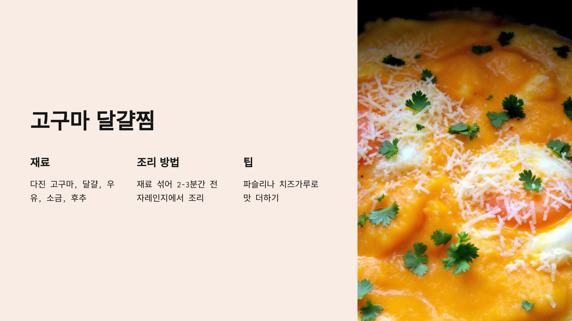 - 재료 준비: 고구마를 작은 크기로 다집니다. 전자레인지용 그릇에 달걀을 풀고, 우유와 다진 고구마를 넣습니다. 소금과 후추로 간을 합니다.